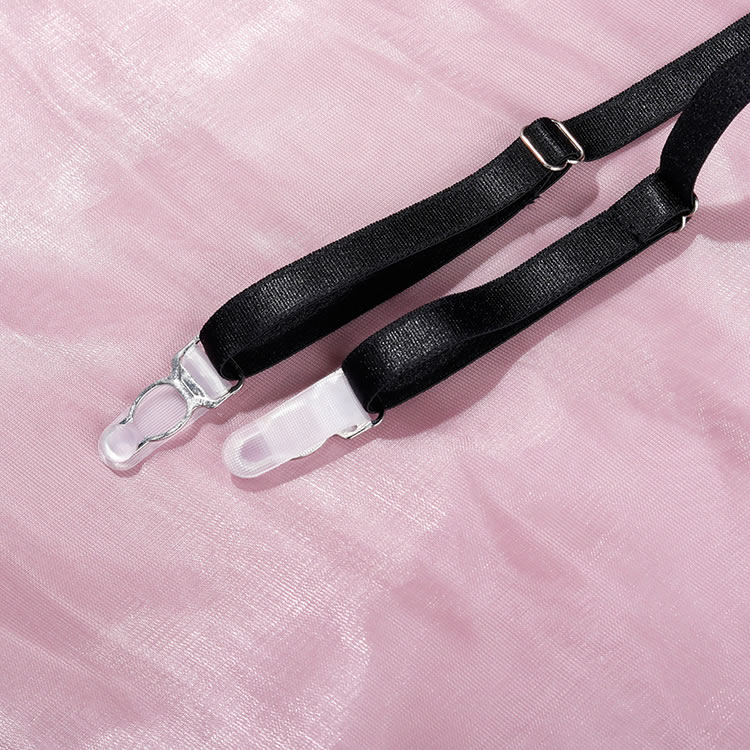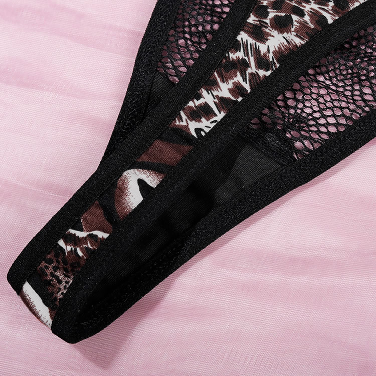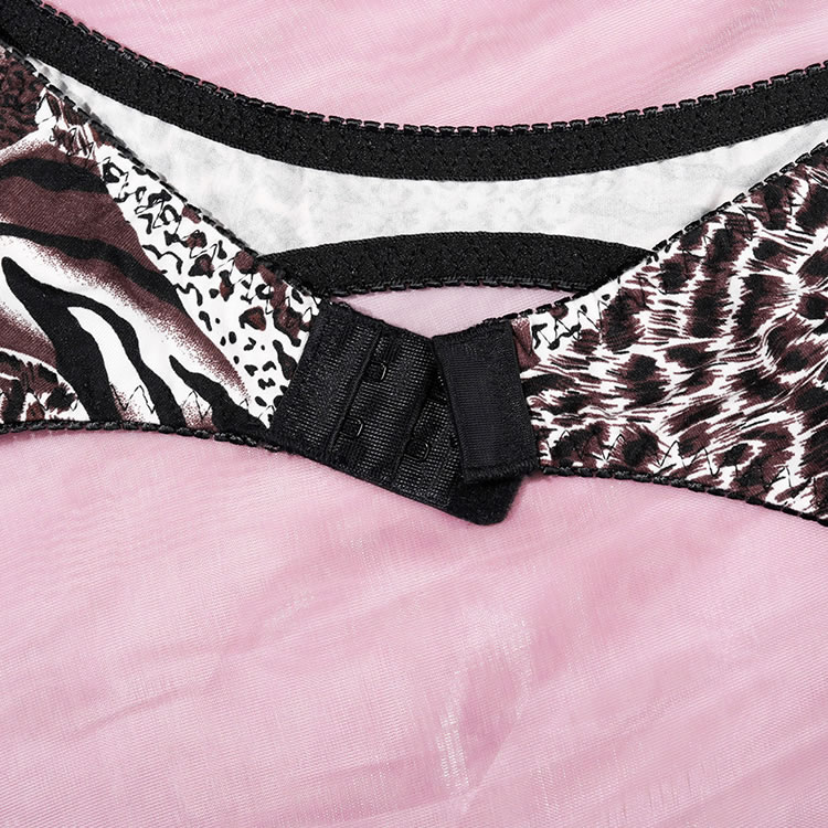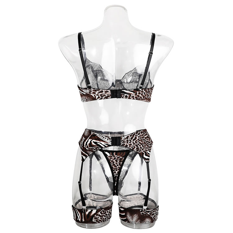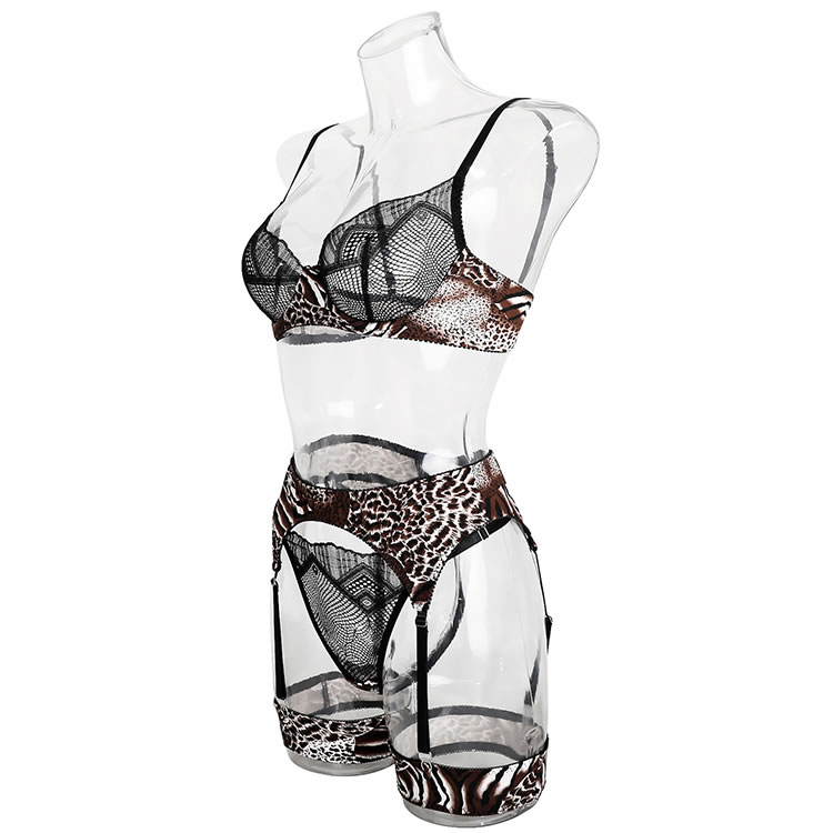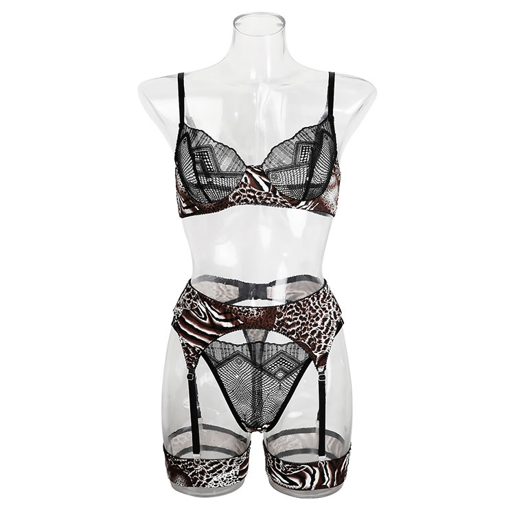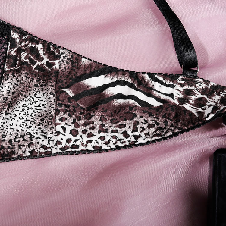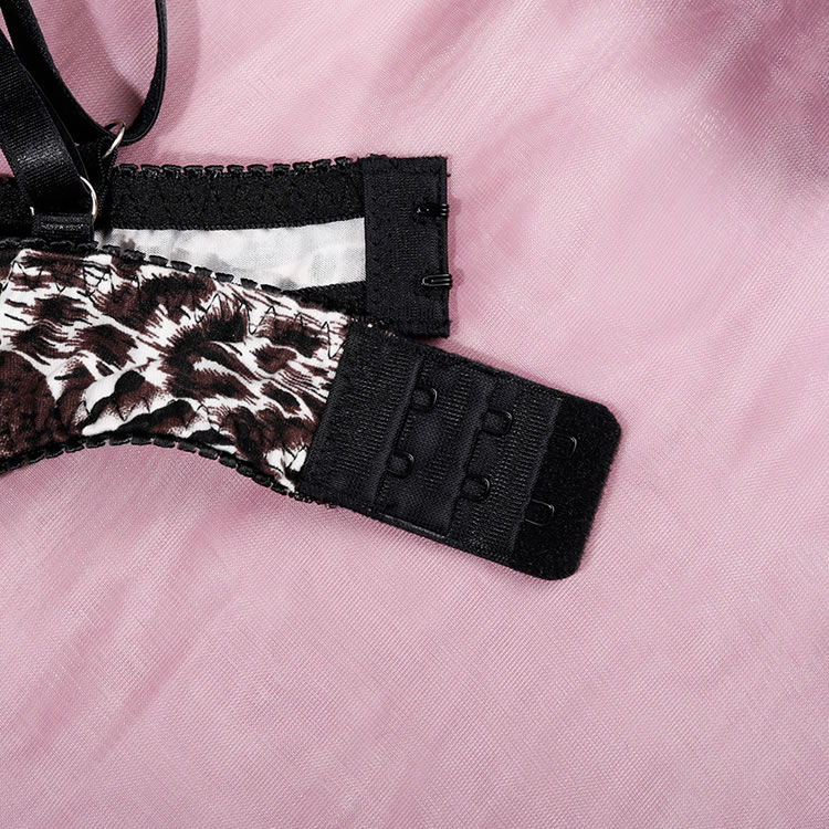 This bold black and white animal-print lingerie set features a striking leopard-inspired pattern with a mix of mesh and solid fabric. The bra offers structured support with thin adjustable straps detail, while the high-cut thong includes an open back design and attached garter straps. The matching thigh bands complete the look with a cohesive, edgy style—perfect for making a statement or adding drama to intimate moments.