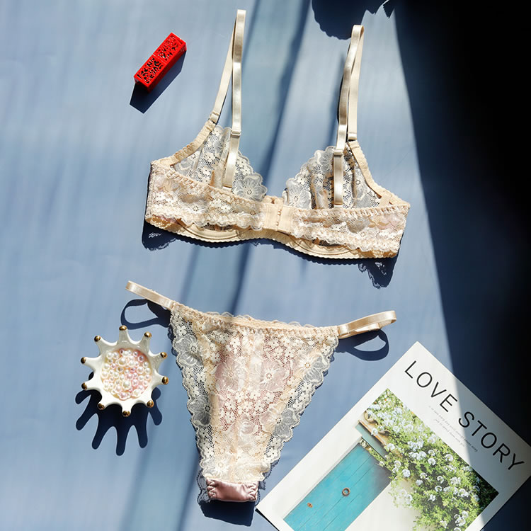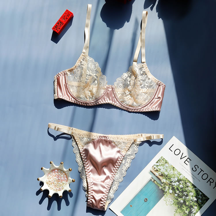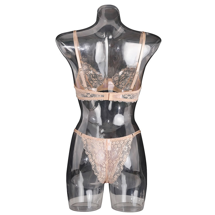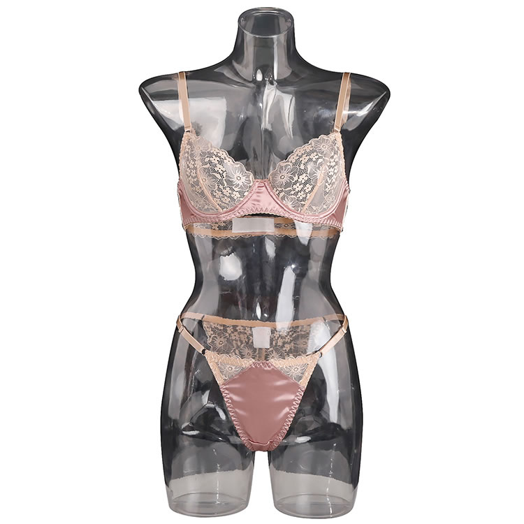 This soft blush lingerie set combines delicate lace with smooth fabric for a balanced look that’s both elegant and modern. The bra features thin adjustable straps and a floral lace overlay that adds texture and charm, while the underwire design offers support and shape. Paired with a matching thong that has a lace-trimmed edge and a satin panel at the front, it creates a refined silhouette perfect for everyday wear or special moments.