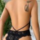 This black lace bodysuit is a bold choice for those who want to make a statement. The intricate lace detailing covers the entire piece, offering both allure and comfort. The halter neck design with crisscross straps at the back adds an extra layer of sophistication, while the open front ensures a daring and seductive look. Perfect for special occasions or intimate moments.