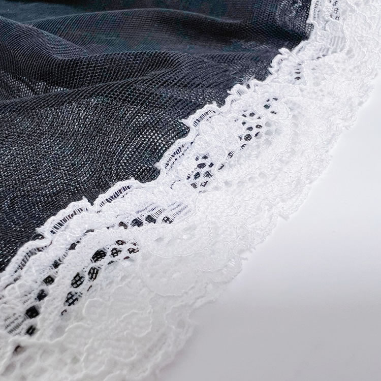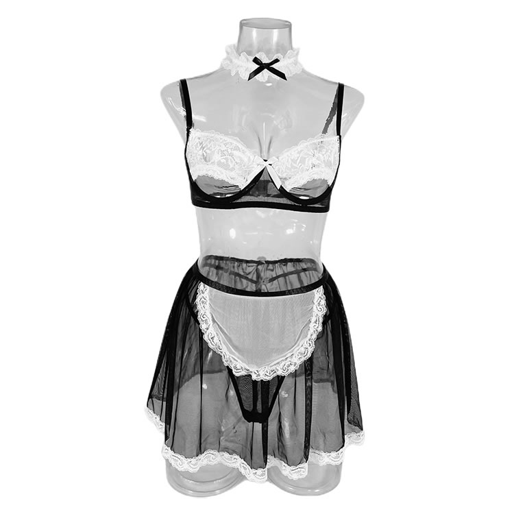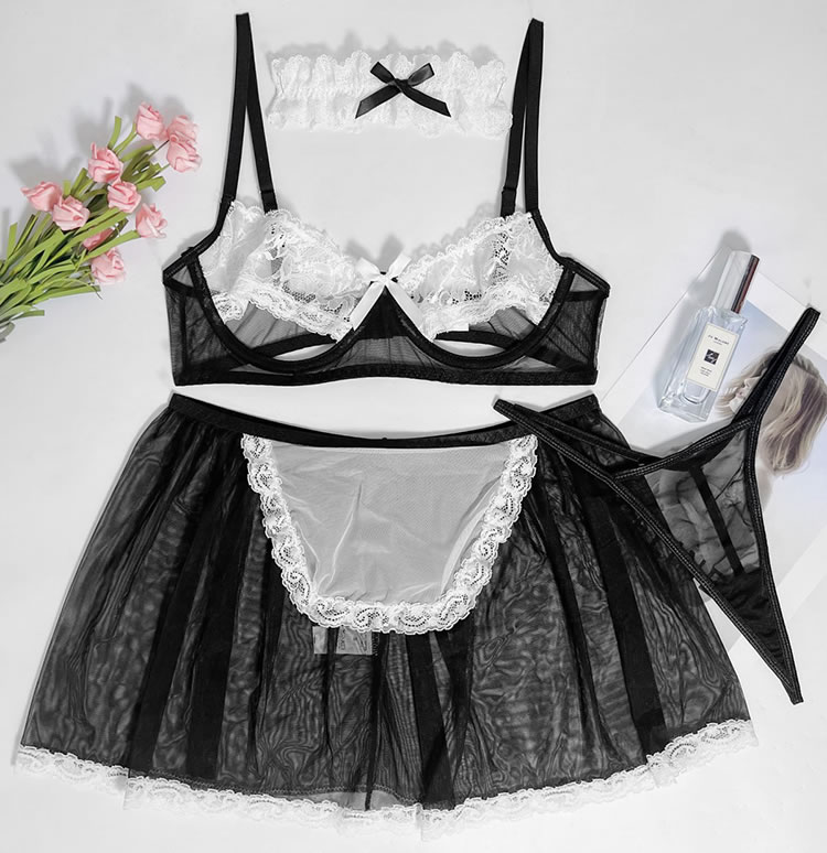 Make a statement in this bold black and white lace maid lingerie set. The intricate lace detailing on the bra and skirt creates a captivating contrast, while the sheer fabric adds an element of allure. This playful ensemble is perfect for those who want to feel both daring and charming.