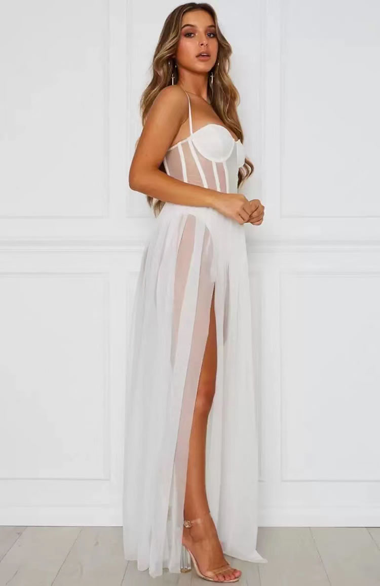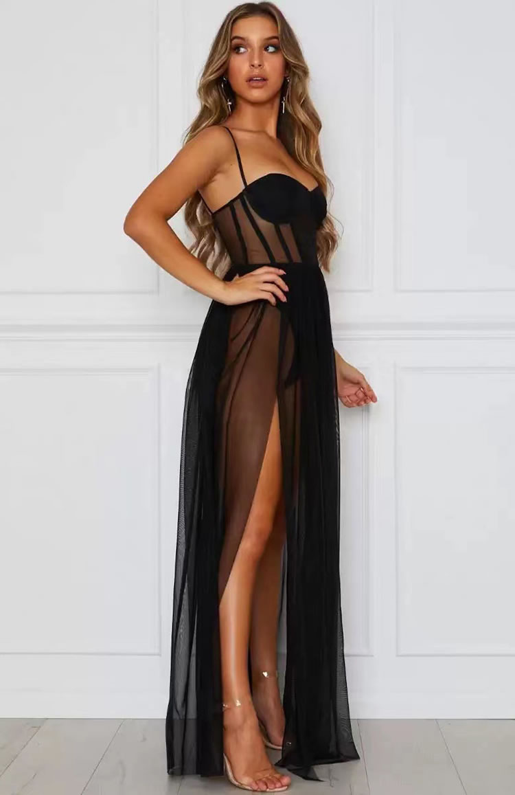 Make a statement with this bold black sheer maxi dress. The dress features a sweetheart neckline and a fitted bodice that accentuates your curves, while the flowing sheer skirt adds a touch of drama and elegance. The high slit on the side ensures ease of movement and a hint of allure. Perfect for those who want to feel confident and stylish at special events or evening gatherings.