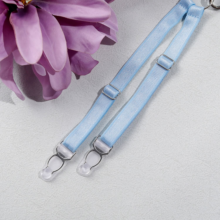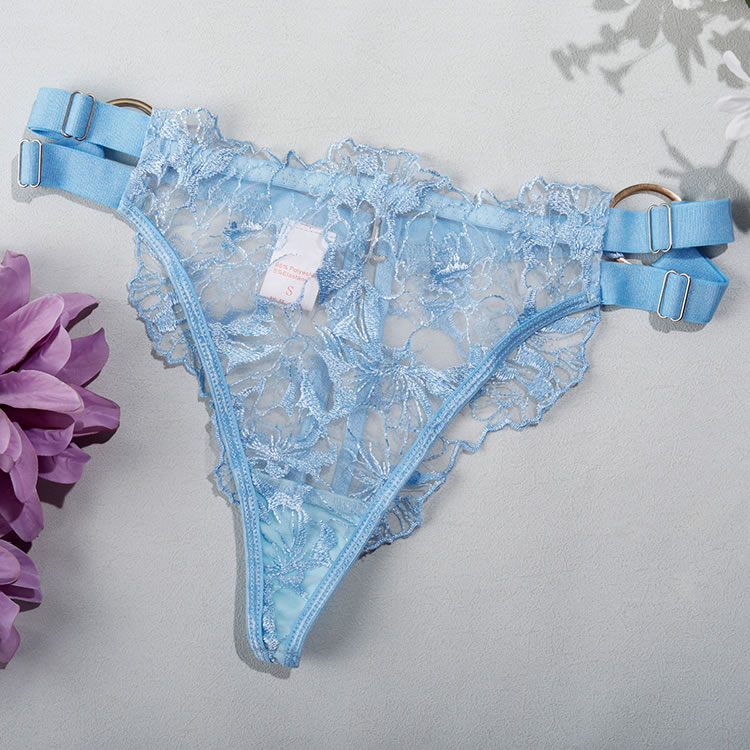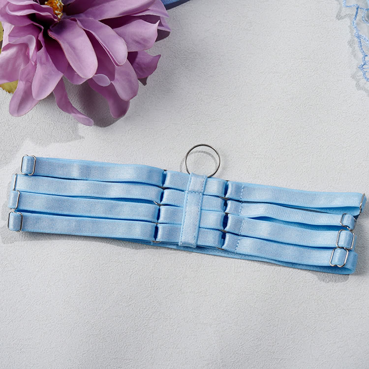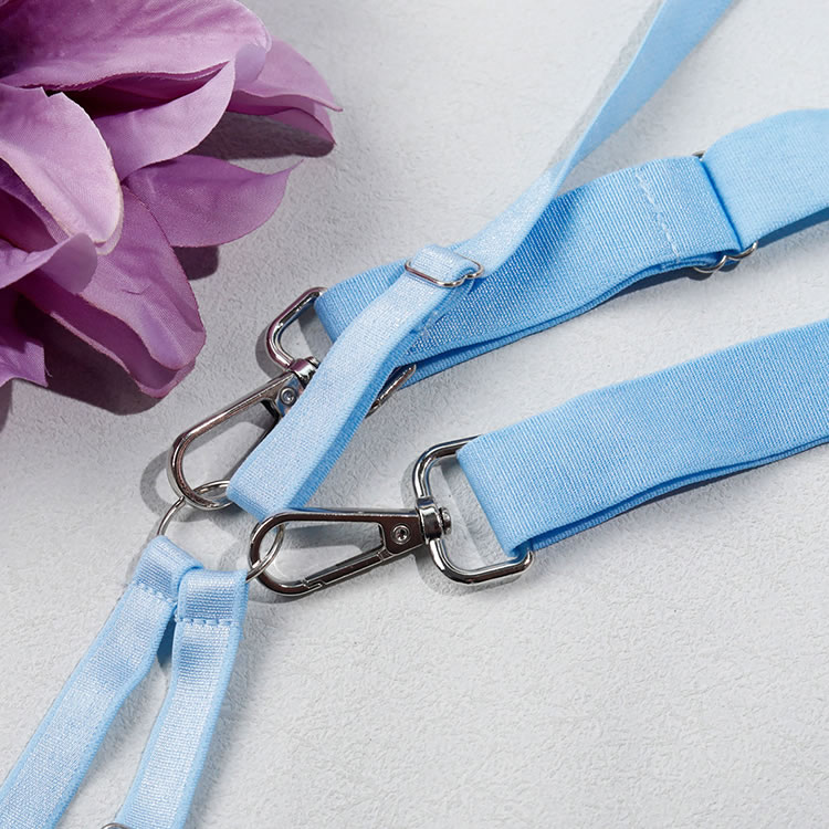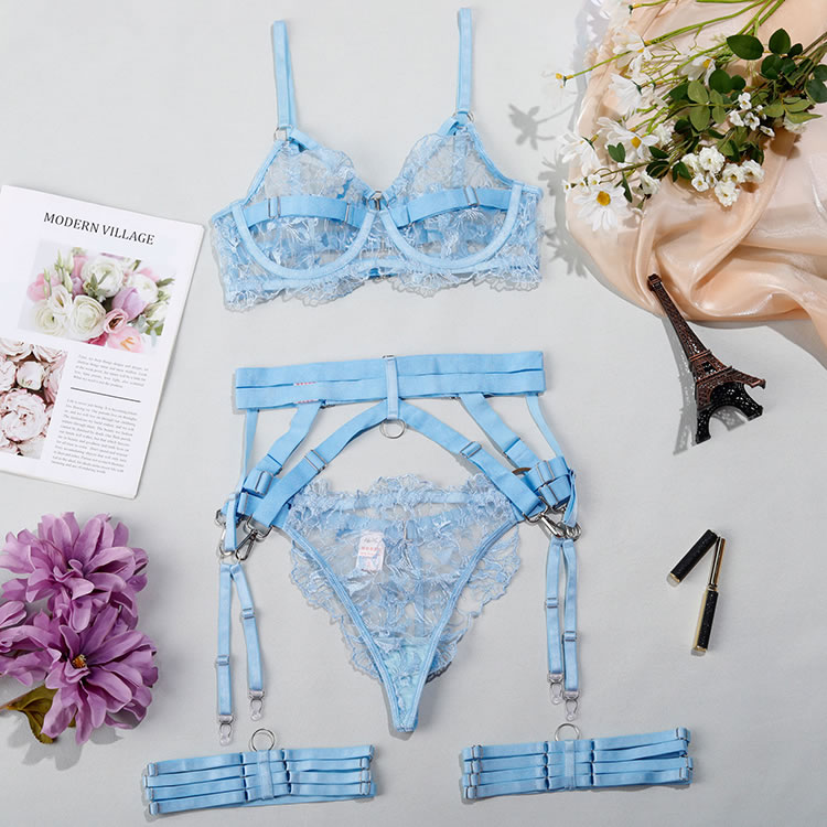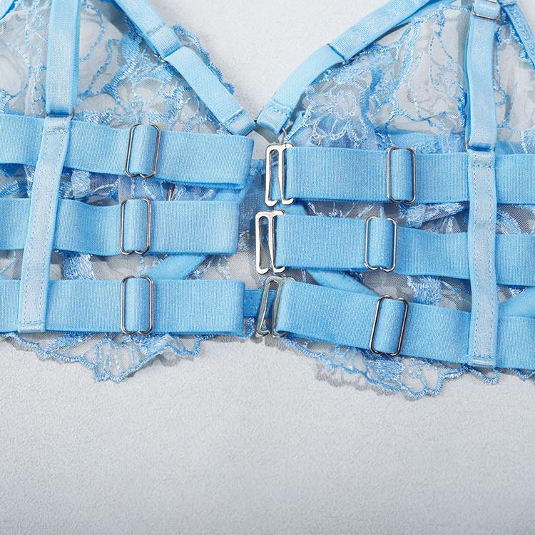 This bold blue lingerie set combines structured straps with intricate lace detailing for a striking look. The bra features a deep plunge design with adjustable bands, metal buckles, and a central ring that adds an edgy touch. Paired with a high-cut garter straps that includes crisscrossed harness-style straps and matching thigh cuffs, it creates a dramatic silhouette perfect for those who enjoy strong, confident styles.