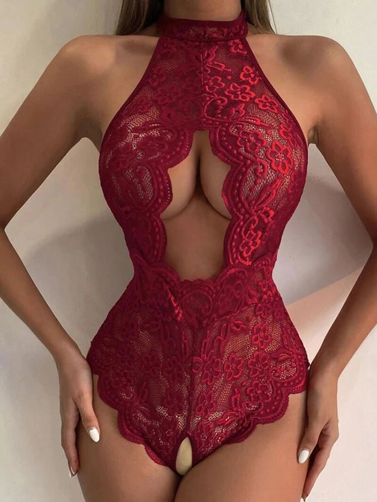 Embrace your inner allure with this captivating red lace bodysuit. The detailed floral lace design and vibrant hue create a visually stunning piece that exudes confidence. With its high neckline, this bodysuit is both stylish and comfortable, ideal for special moments or everyday wear.