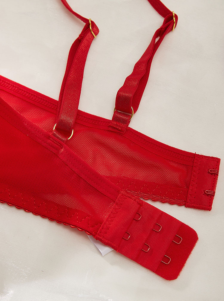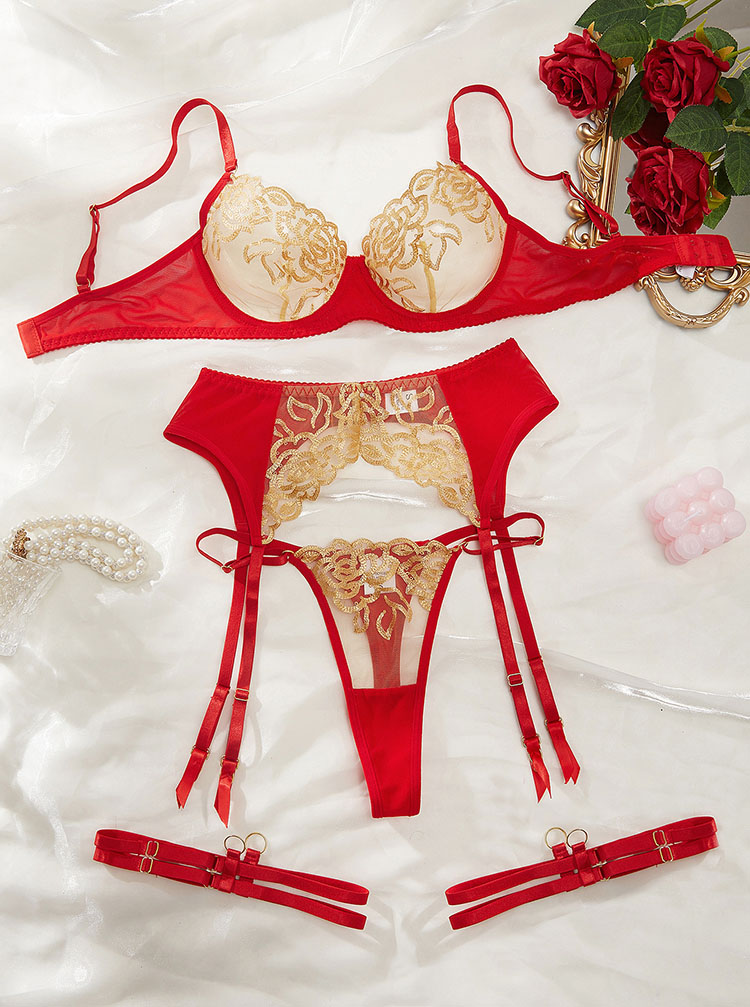 Step into sultry sophistication with this red and gold lace bra set ensemble. The detailed lace patterns and vibrant color make it a standout piece in any lingerie collection. The bra provides excellent support with its structured design, and the garter belt adds a playful yet elegant touch. Perfect for adding a dash of romance to your intimate moments.