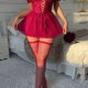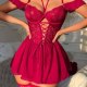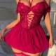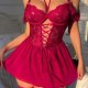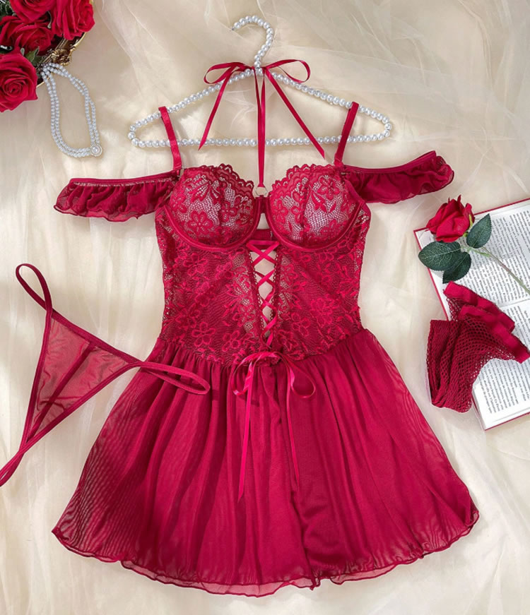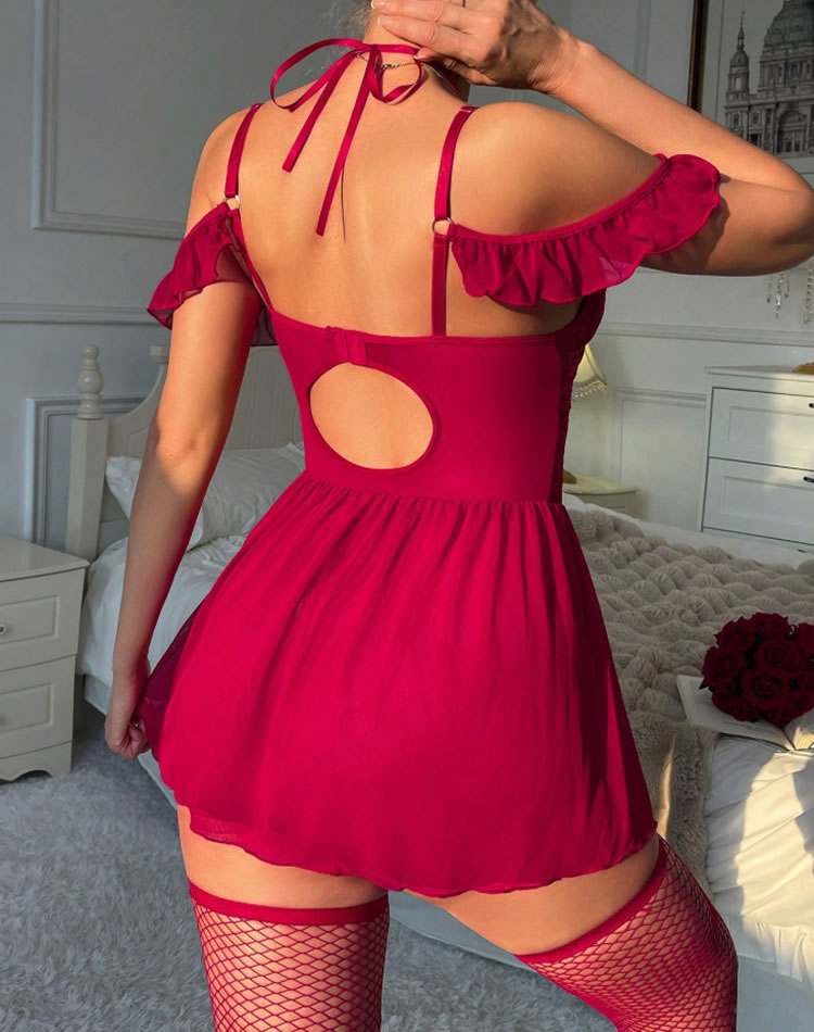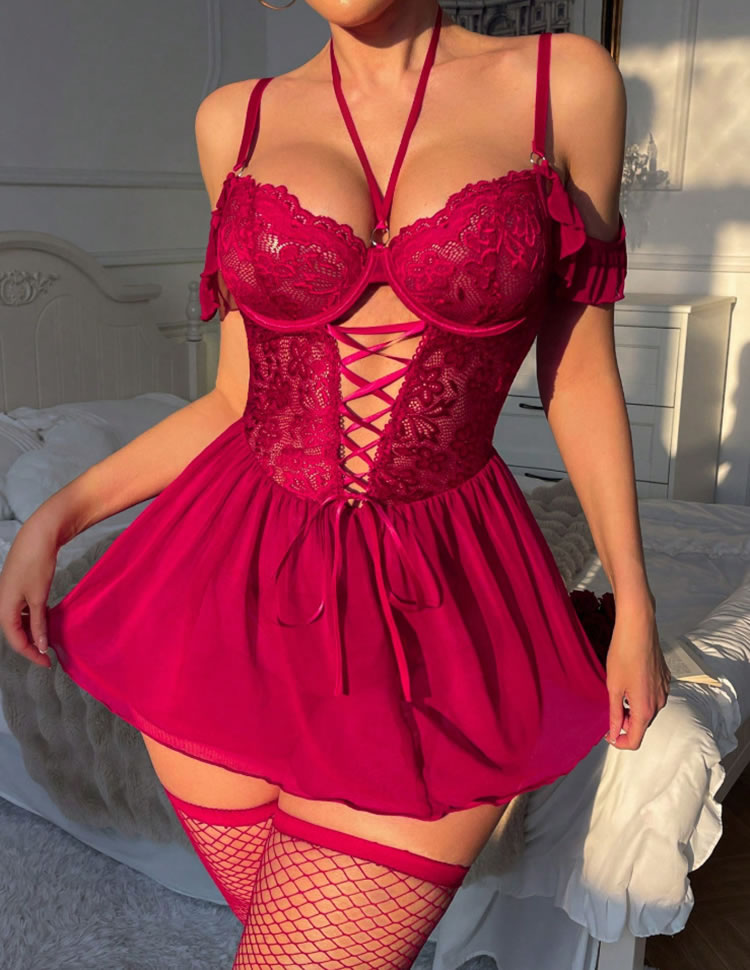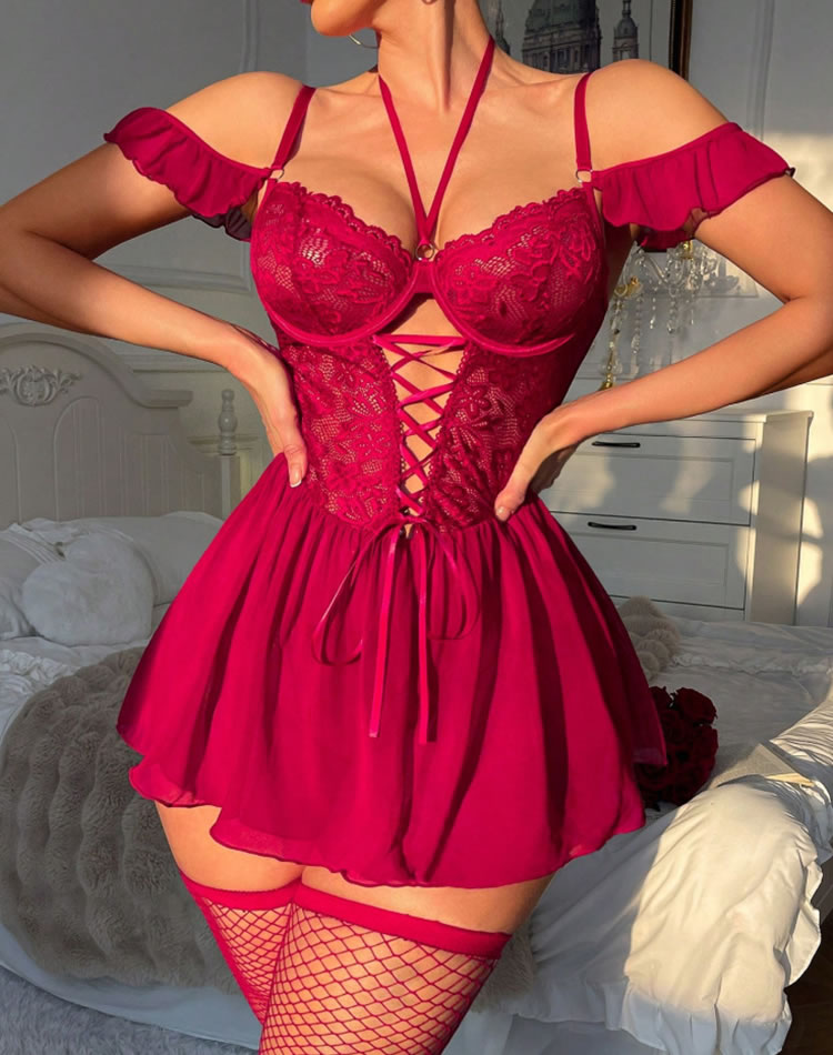 This eye-catching chemise features rich red lace across the bust and waist, paired with a flowing mesh skirt. The halter neckline ties at the back, while off-shoulder ruffle sleeves add playful flair. Front lace-up detailing enhances the silhouette — perfect for making a confident statement.