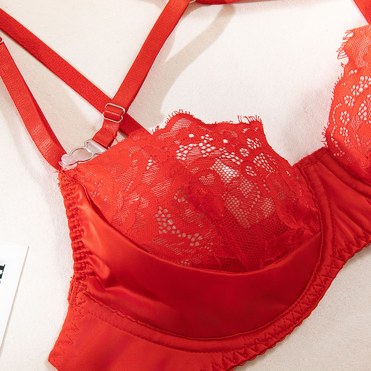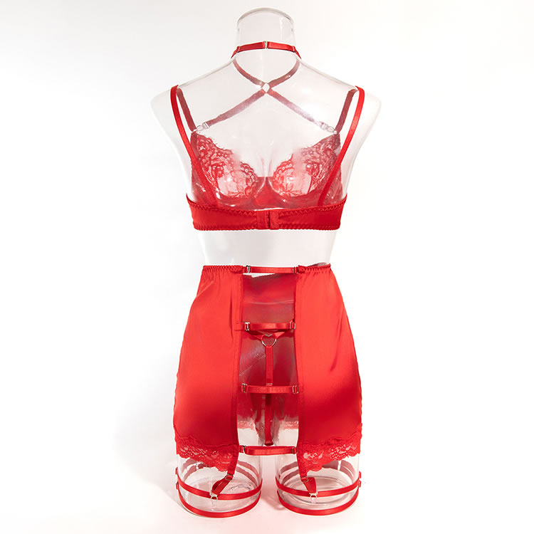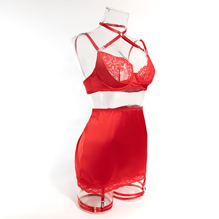 This bold red lace lingerie set is a striking choice for those who love to make a statement. The bra features intricate lace detailing that adds a touch of elegance and allure, while the matching skirt and garters ensure both style and support. The vibrant red color creates an eye-catching silhouette, making it perfect for anyone seeking a blend of confidence and charm in their intimates.