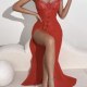 This striking red lingerie dress features a lace-adorned bustier top with underwire support and delicate embellishments along the cups, offering both shape and elegance. The fitted silhouette hugs the body from bust to hip, accentuating curves with confidence. A high front slit reveals a bold leg line, while thin spaghetti straps and a low back add drama. Designed with a drawstring waist detail, it enhances the figure and adds a touch of playful allure—perfect for making a statement at night or wearing as a daring piece of intimate fashion.