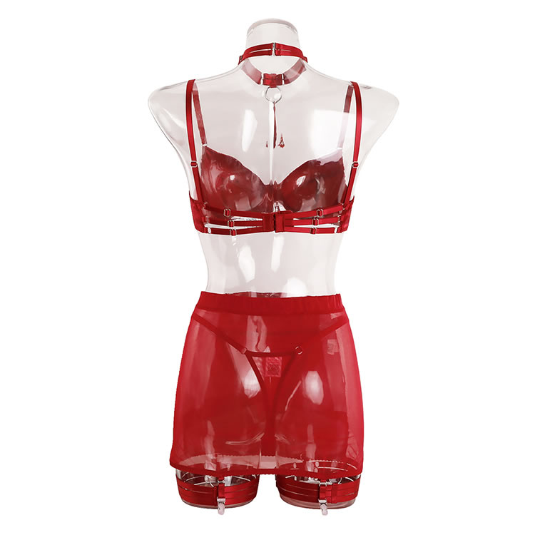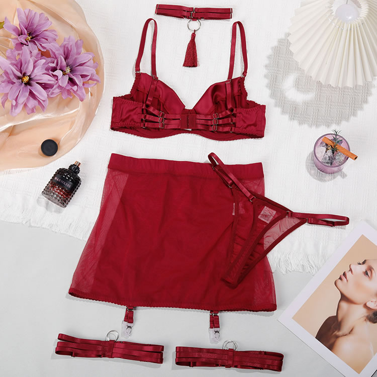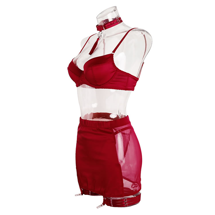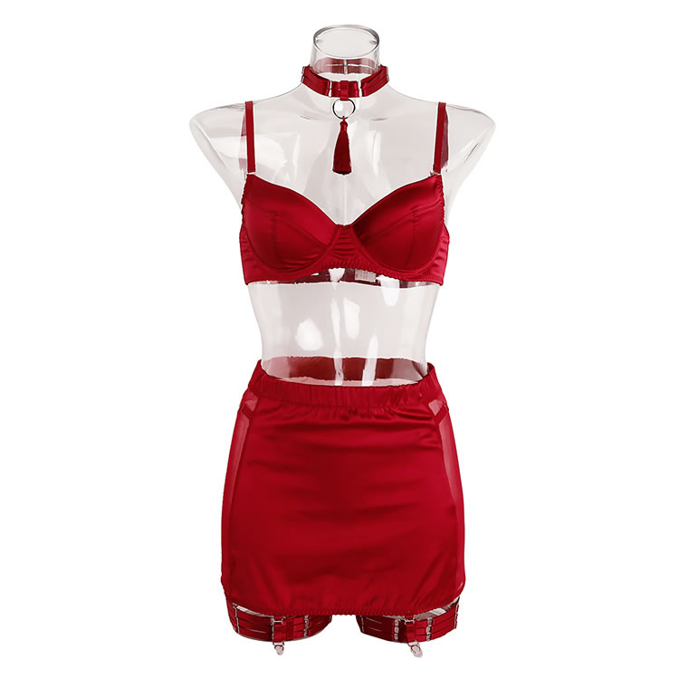 This bold red satin bra and skirt set features a sleek, form-fitting design that accentuates your curves. The garters add a playful touch, while the soft satin material ensures comfort and style. Perfect for those who want to feel confident and alluring in their intimate moments.
