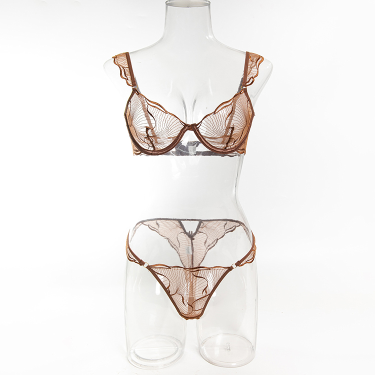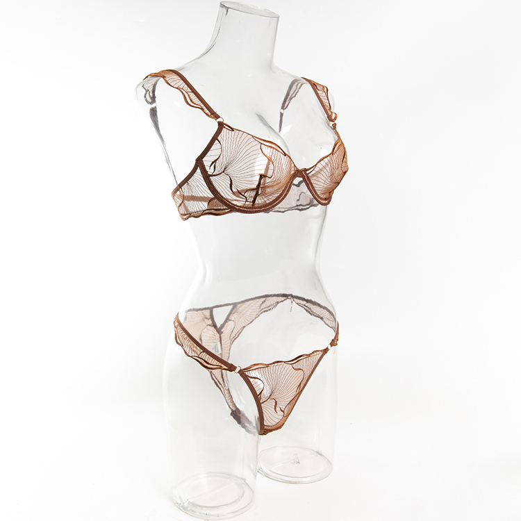 This elegant two-piece lingerie set features a underwire bra and matching thong crafted from semi-sheer mesh adorned with intricate leaf-like embroidery that mimics organic veins for a nature-infused aesthetic. Ruffled lace trim outlines the shoulder straps and waistband for soft definition. Adjustable shoulder straps and a secure back closure ensure a personalized fit, while the minimalist silhouette enhances your natural shape. Perfect for those who appreciate botanical motifs and refined simplicity in their intimate wear.