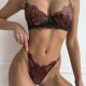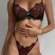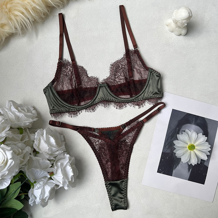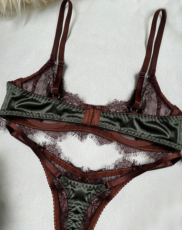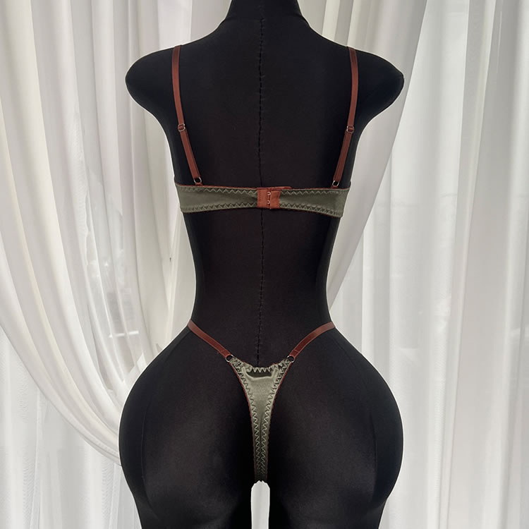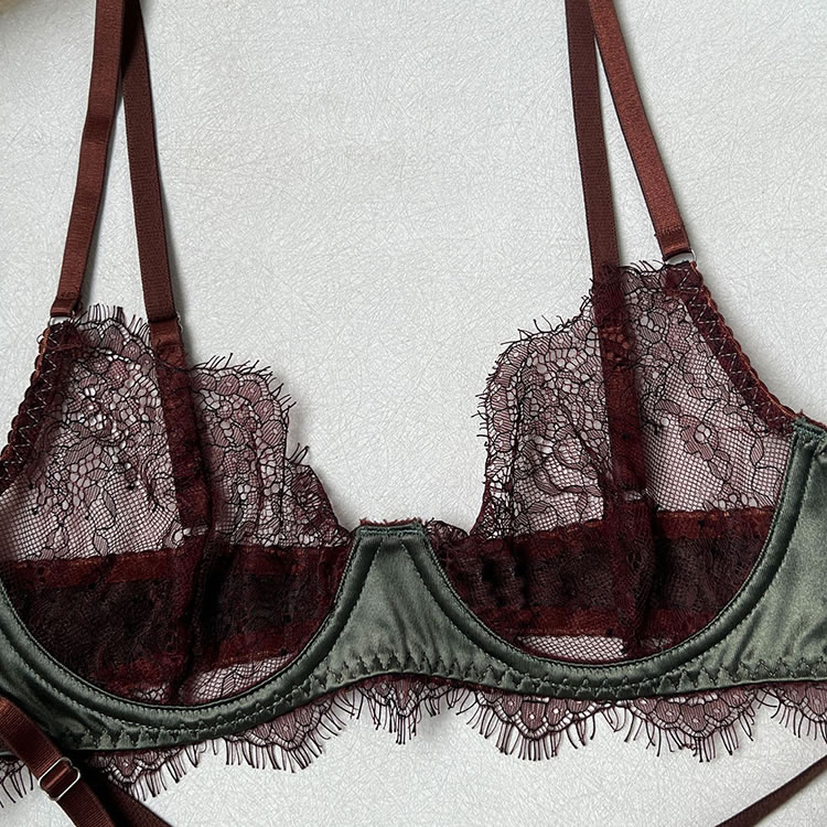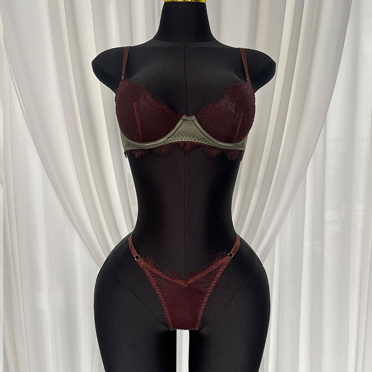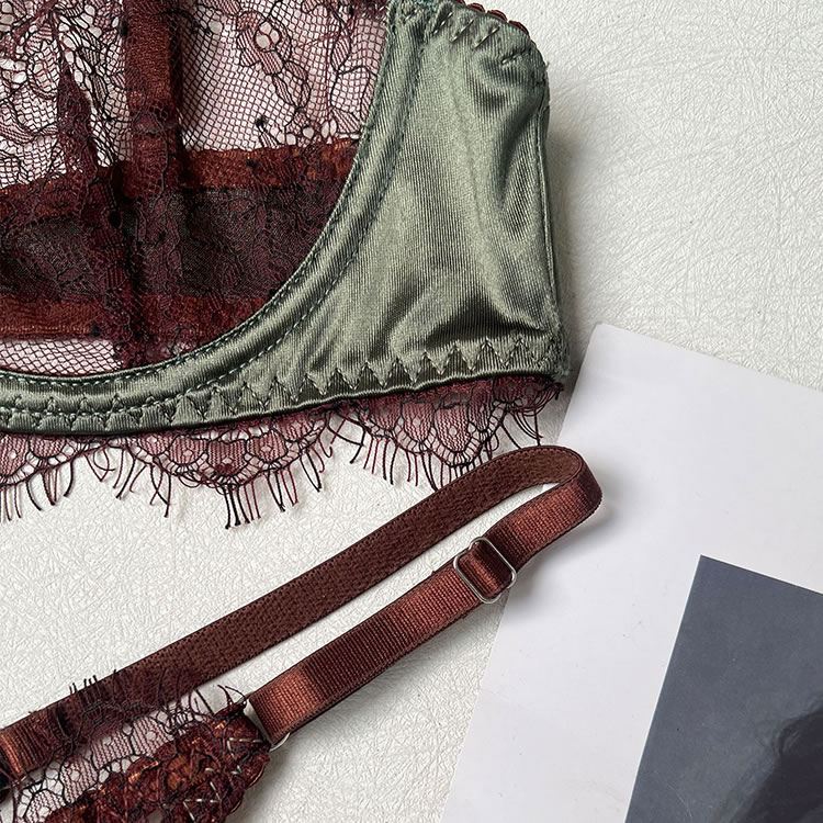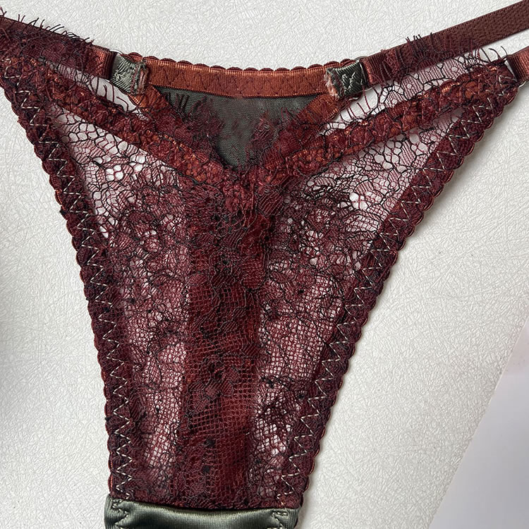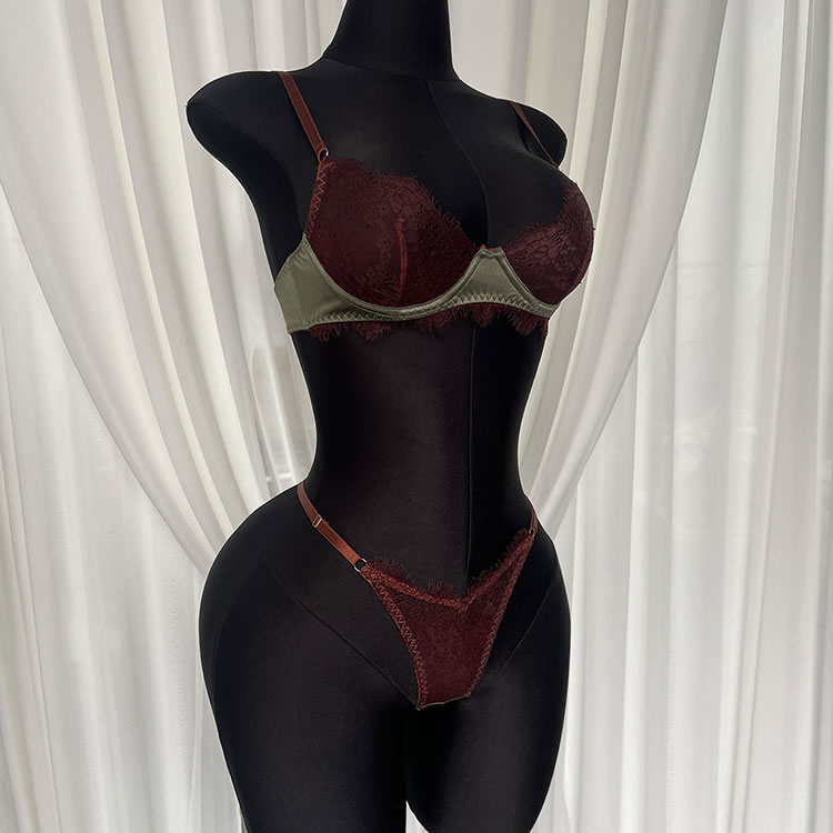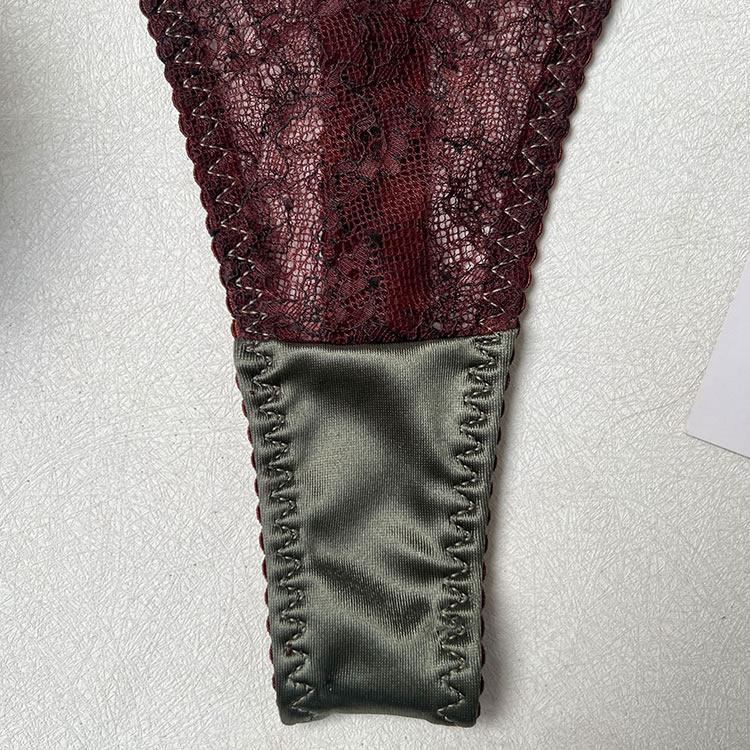 This lingerie set masterfully blends delicate romance with bold structure. The cups and front panel of the thong are crafted from intricate burgundy floral lace, offering a soft, feminine touch. This is strikingly contrasted by smooth, olive-green bands that feature precise, decorative stitching along the edges—a detail echoed on the back of the thong and the bra’s underband. Adjustable burgundy straps and a functional multi-hook closure at the back ensure a secure and personalized fit. The result is a thoughtfully designed set that balances texture and color for a uniquely captivating look.