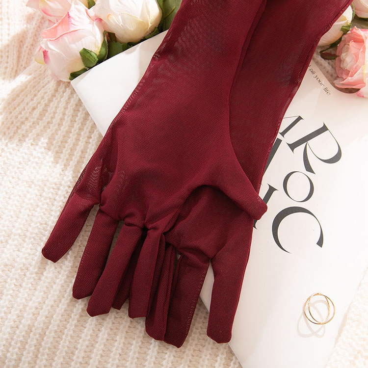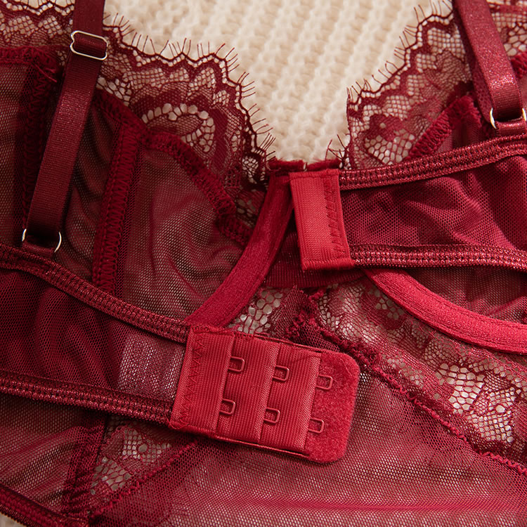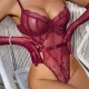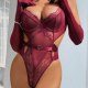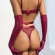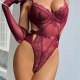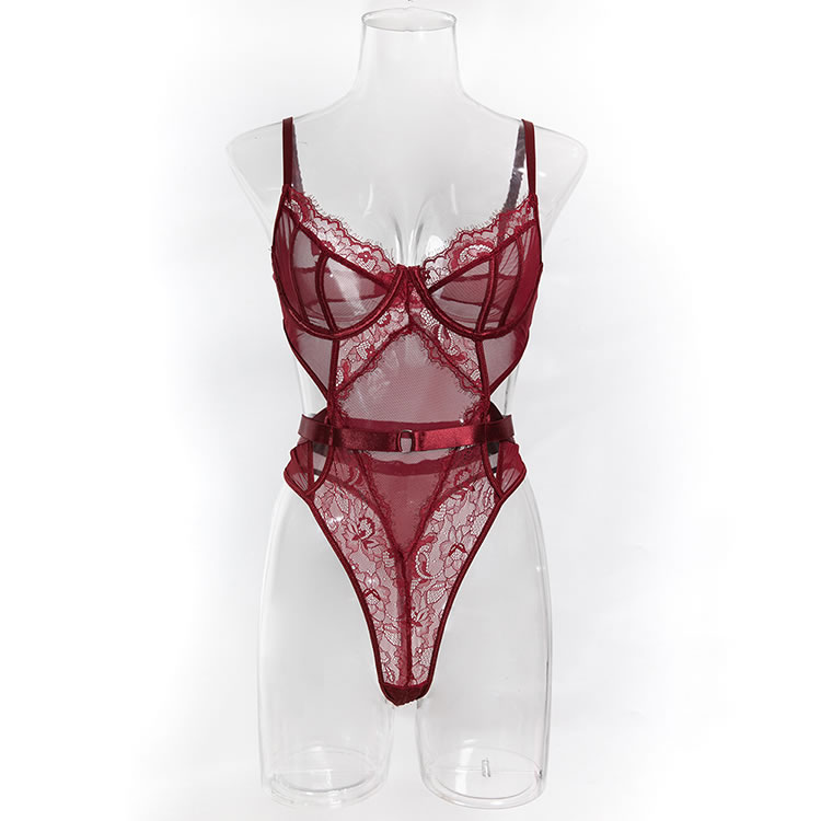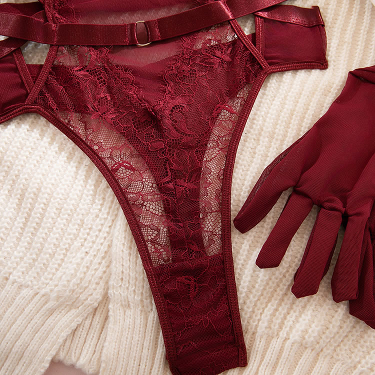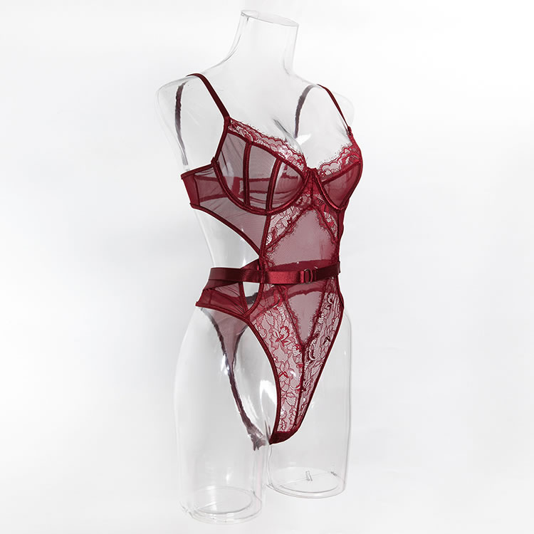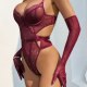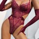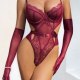 This deep burgundy lingerie bodysuit features a structured bra top with lace trim and a plunging neckline that highlights the bust. The midsection includes a wide waistband with a buckle detail and side cut-outs that add drama and dimension. The lower part is crafted from sheer mesh with floral lace patterns, creating a balance between coverage and transparency. Paired with matching long gloves that extend to the elbows, this set offers a bold, confident look perfect for those who love a mix of vintage flair and modern edge.