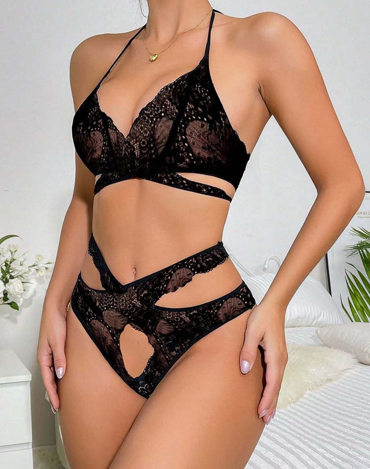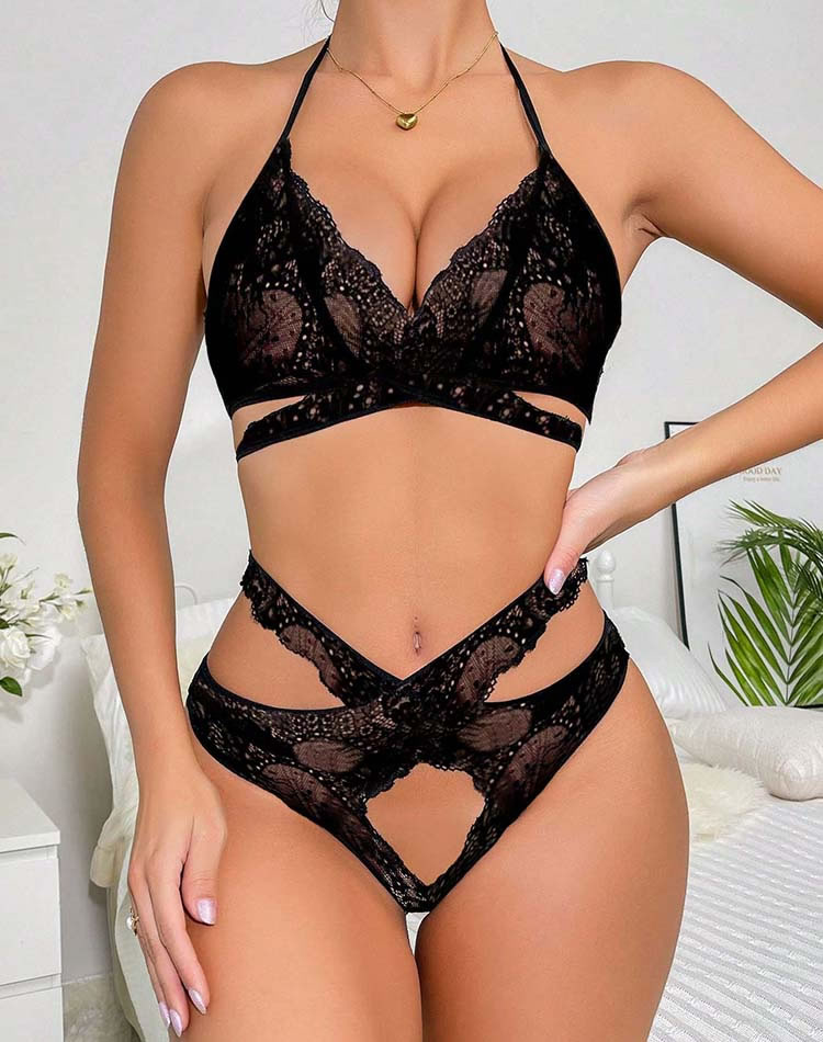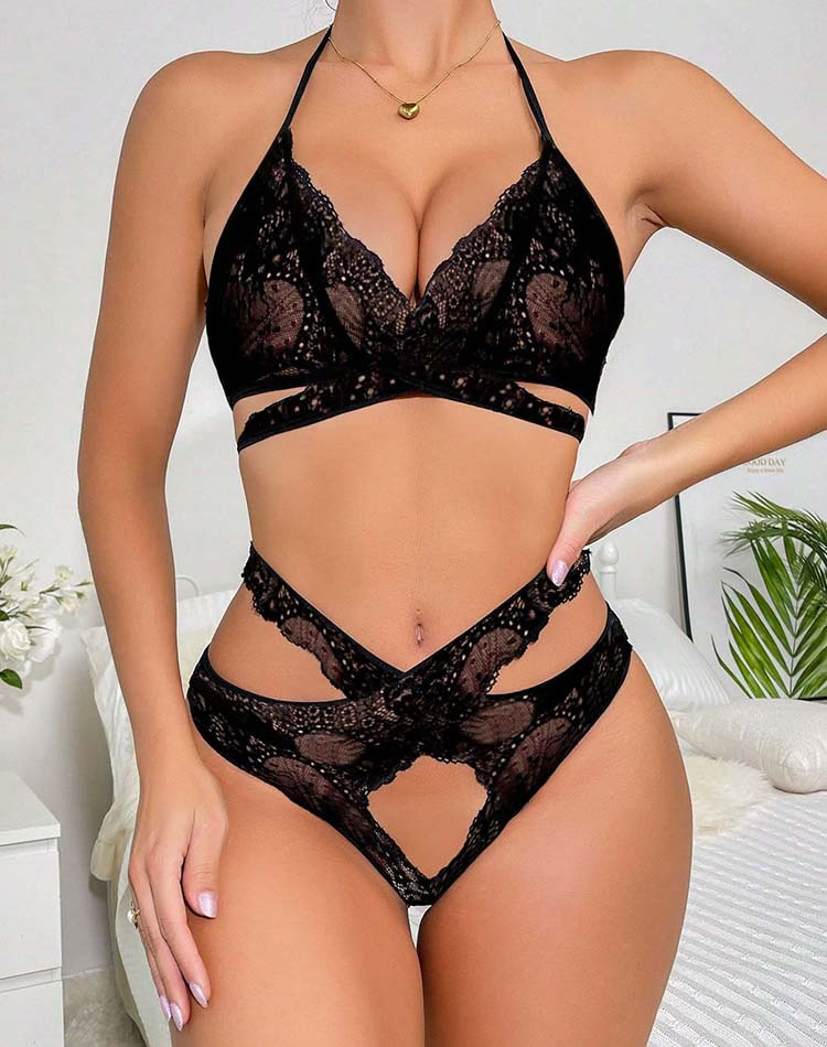 Let your hair down in this ultra lovely bra set featuring sheer lace cups with criss-cross underbust straps, halter ties, a tie back closure, and a matching criss-cross lace panty with a small front and back keyhole, a tie back closure, and a cheeky cut back.