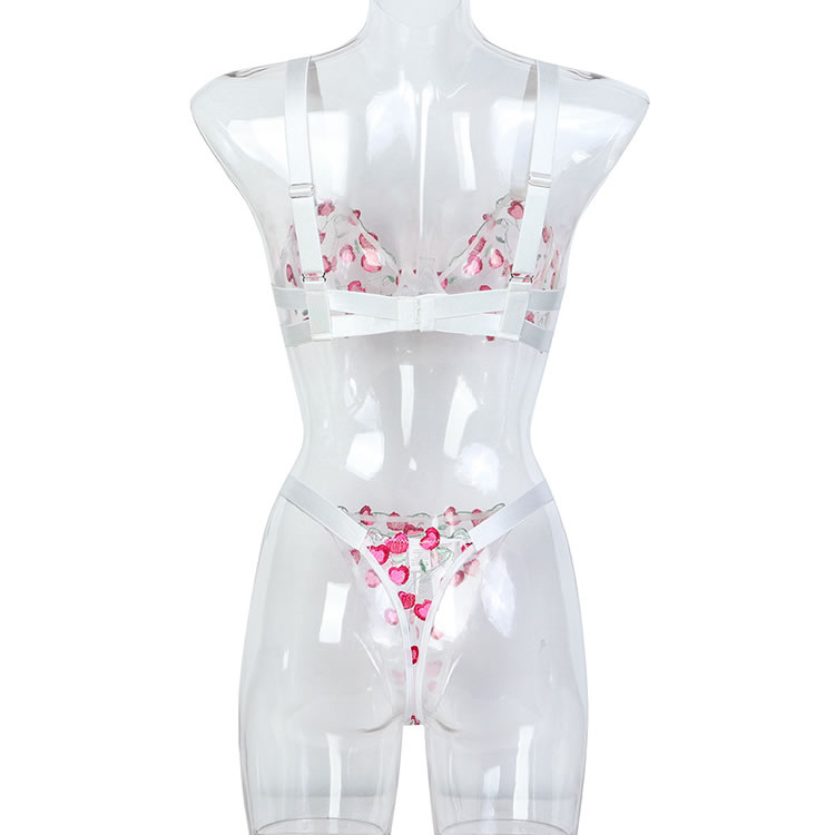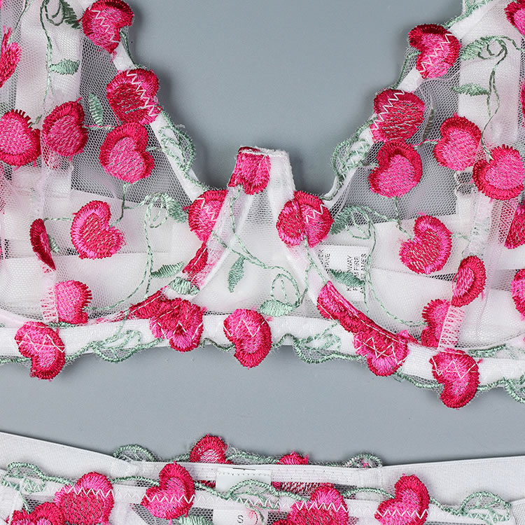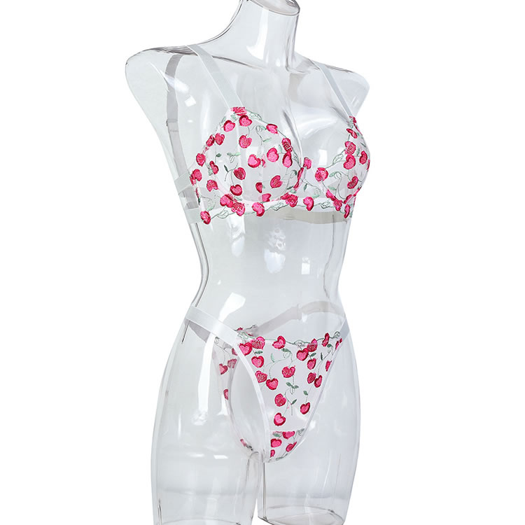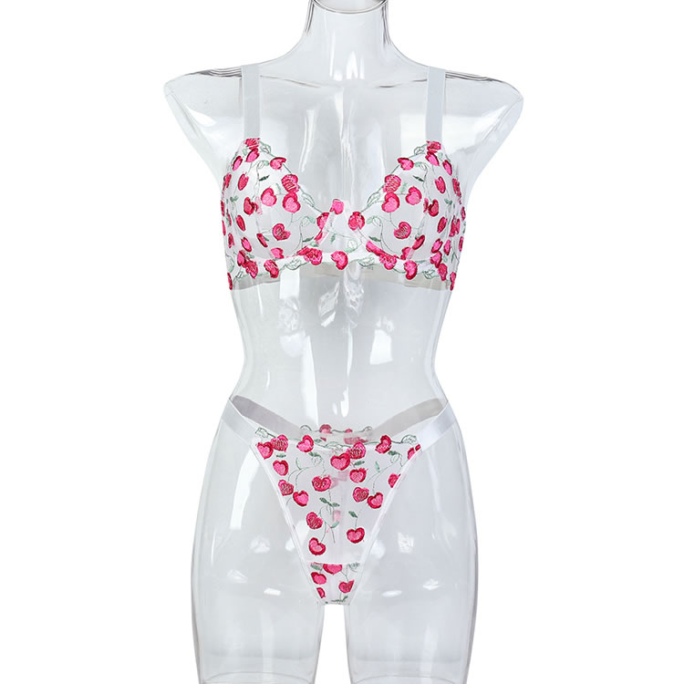This exquisite lingerie set is designed to captivate with its charming and elegant design. The bra features a deep V-neckline with intricate cherry embroidery on sheer fabric, adding a touch of playfulness and sophistication. The matching high-cut thong complements the bra with the same cherry embroidery, creating a cohesive and alluring look. The white straps and trim provide a clean and classic contrast, making it perfect for special occasions or intimate moments.