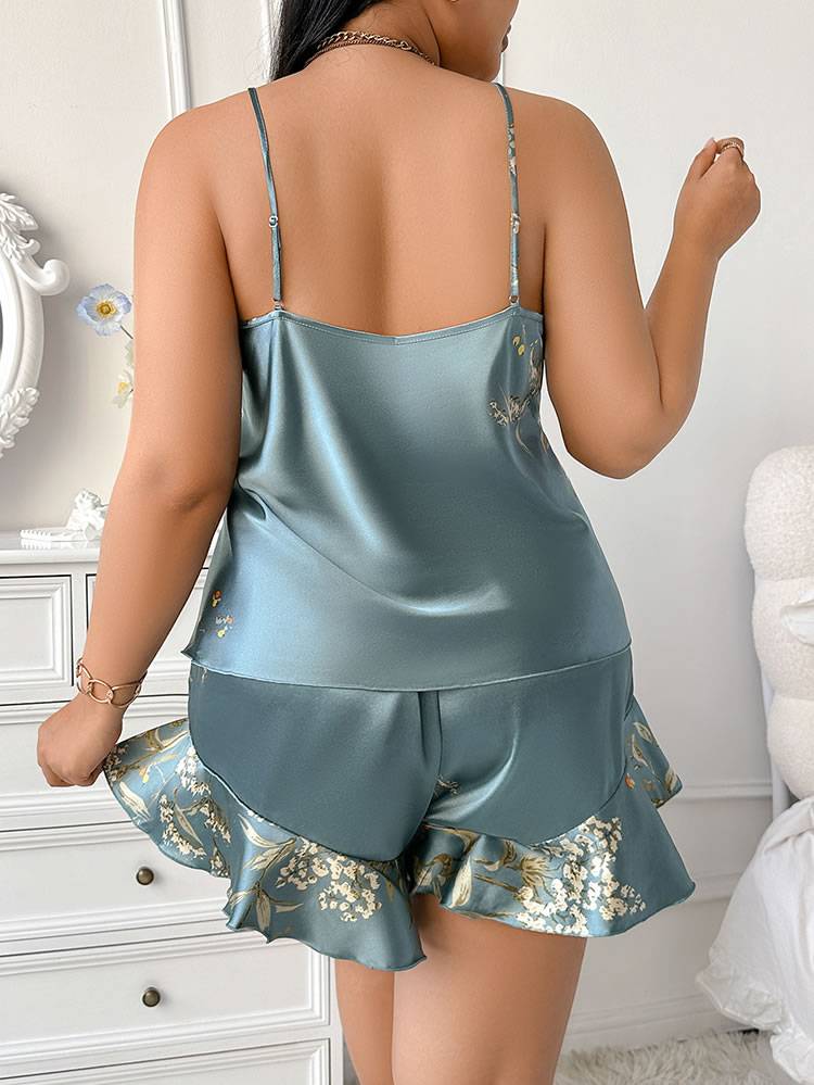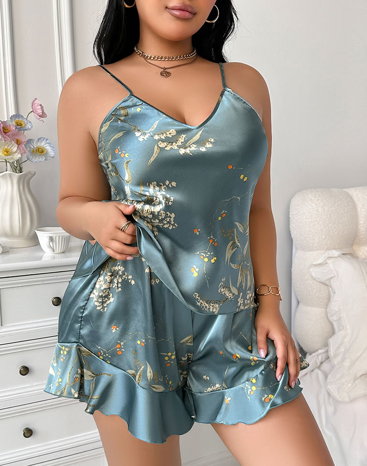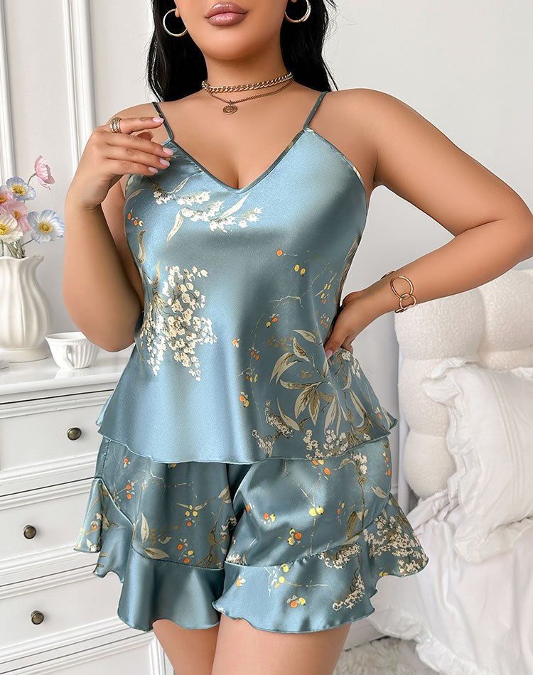 This charming set features a soft satin camisole with a V-neckline and delicate floral print, creating a feminine and stylish look. The matching shorts are adorned with ruffle details at the hem, adding a playful touch. Perfect for relaxing evenings or special occasions, this set combines comfort with elegance.