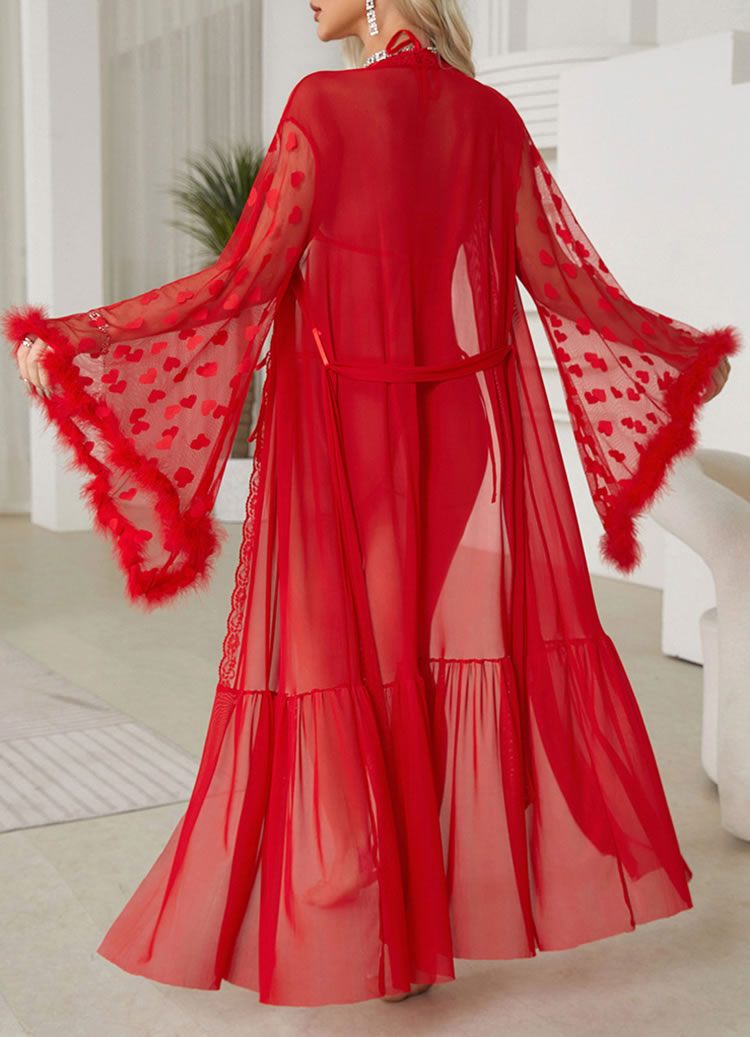 This charming lingerie set is designed to exude elegance and allure. The deep V-neckline is adorned with intricate lace detailing, adding a touch of romance and sophistication. The sheer fabric enhances the visual appeal, creating a seductive and feminine look. The fitted accentuates the figure, while the flowing skirt provides a comfortable and graceful silhouette. The bell sleeves feature heart patterns and feather trim, adding a charming and playful detail. This set is perfect for special occasions or intimate moments.