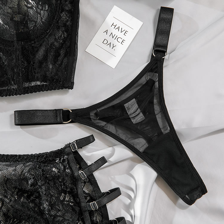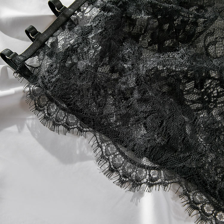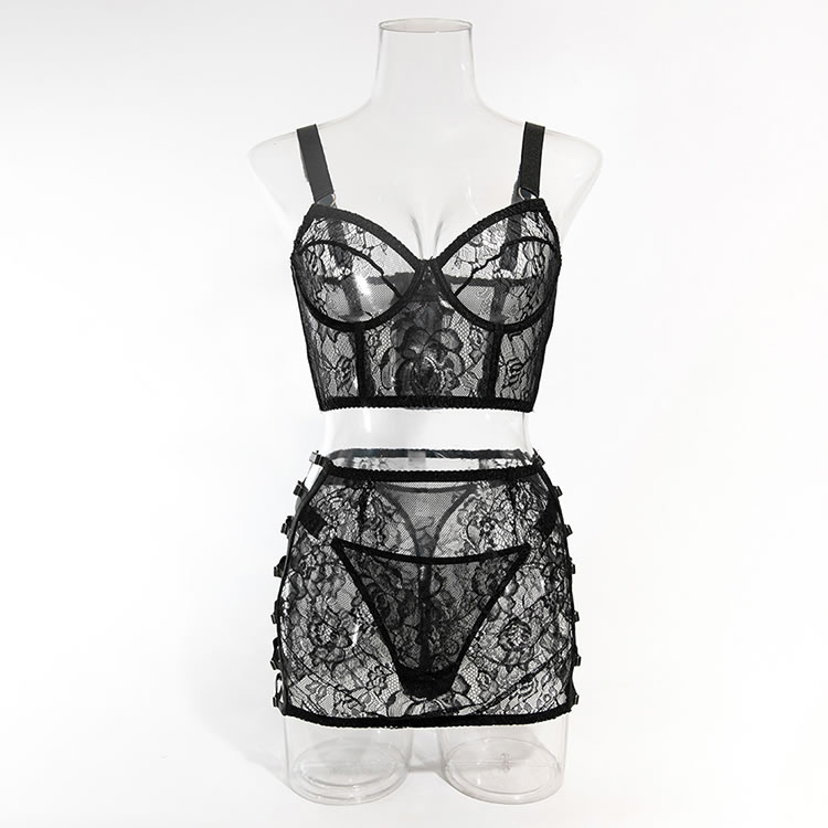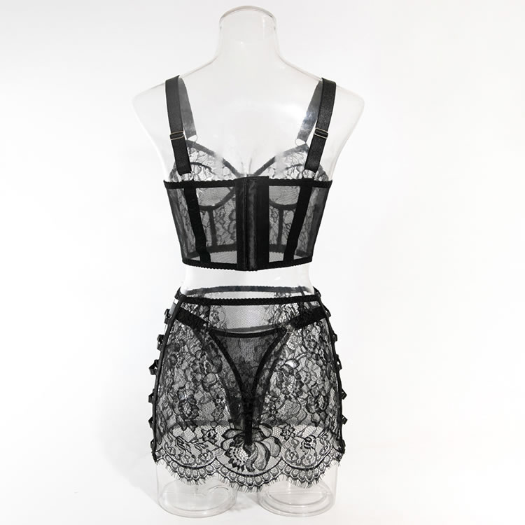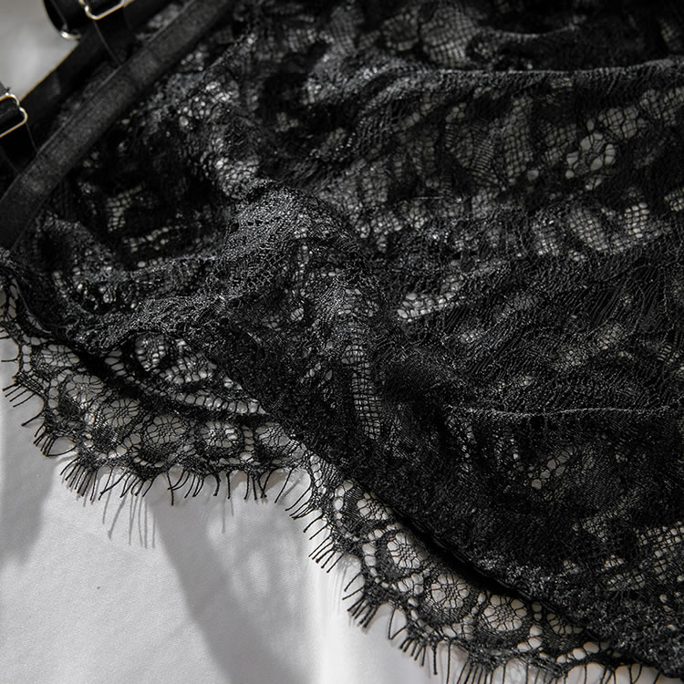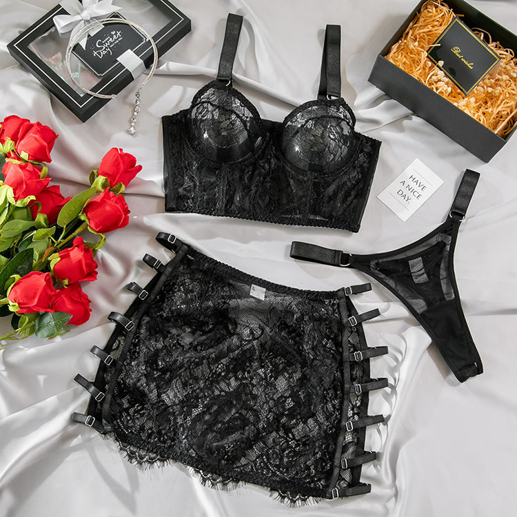 This exquisite lingerie set features a stunning combination of black lace and sheer mesh, offering a perfect blend of sophistication and allure. The sweetheart neckline enhances the décolletage beautifully, while the intricate lace detailing adds a touch of elegance. The fitted design accentuates the figure, and the adjustable straps provide a comfortable and customizable fit. The matching skirt with side lace-up details adds a modern edge, making it ideal for both intimate moments and stylish boudoir photoshoots.