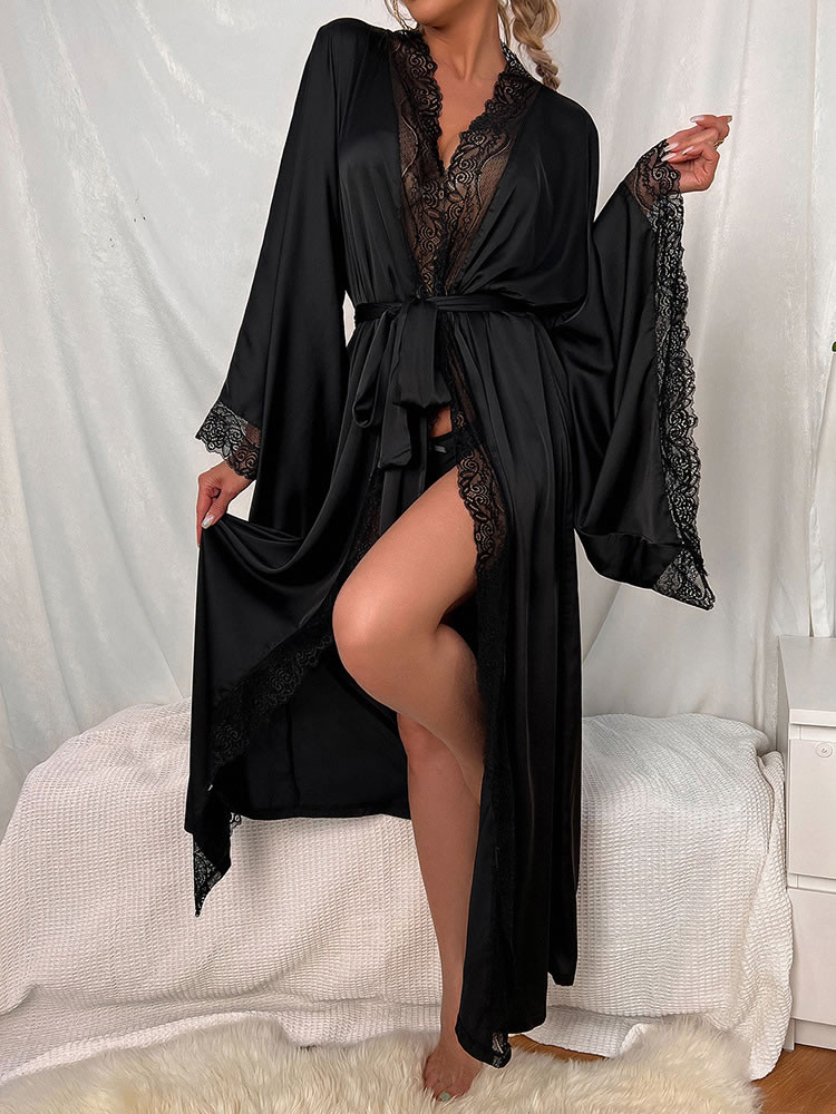 This romanticlingerie set is designed to exude elegance and sophistication. The robe features a deep V-neckline with intricate lace detailing, providing both allure and comfort. The silky fabric offers a smooth and soft feel against the skin, while the wide sleeves and hem are trimmed with delicate lace, adding a touch of romance. The matching belt cinches the waist for a flattering fit. This set is perfect for special occasions or as a seductive addition to your intimate wardrobe.