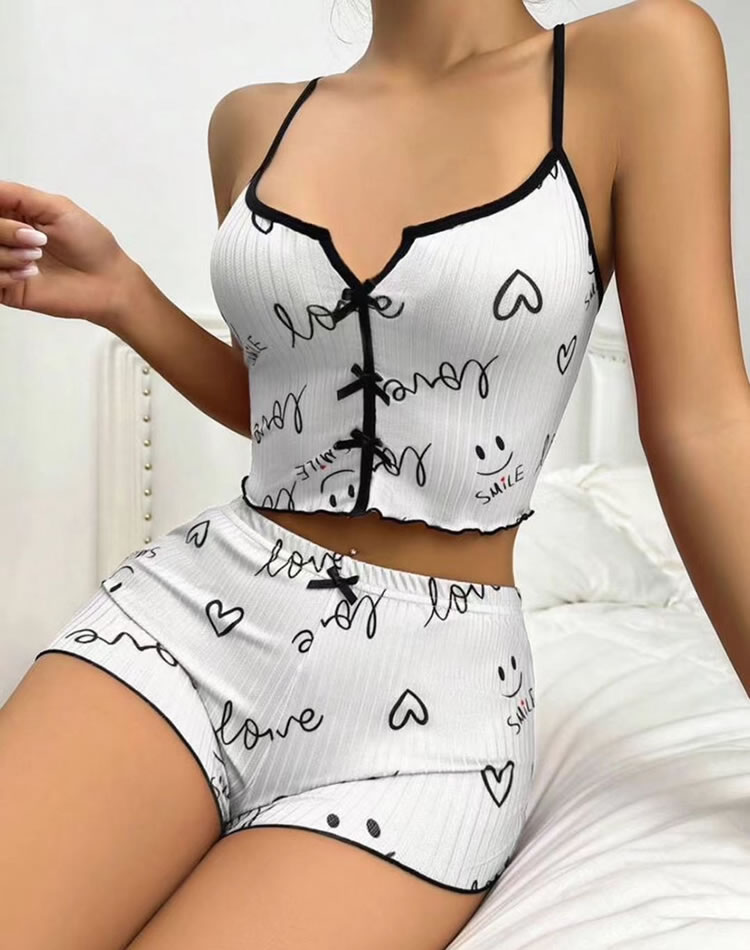 Step into comfort and style with this adorable heart print lingerie set. The soft, ribbed fabric ensures all-day comfort, while the playful heart pattern adds a touch of whimsy. The top features delicate satin bow details that enhance its feminine appeal, and the matching shorts complete the look with a cute bow at the waist. Perfect for lounging or adding a sweet vibe to your sleepwear collection.