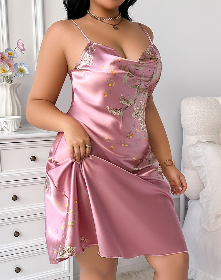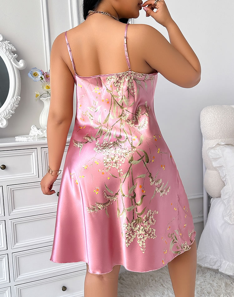 Step into style with this stylish pink satin nightgown adorned with a beautiful botanical design. The dress boasts a deep V-neckline and delicate spaghetti straps, providing both comfort and a chic look. Made from high-quality satin, it offers a silky feel against the skin, making it ideal for special nights or everyday wear.