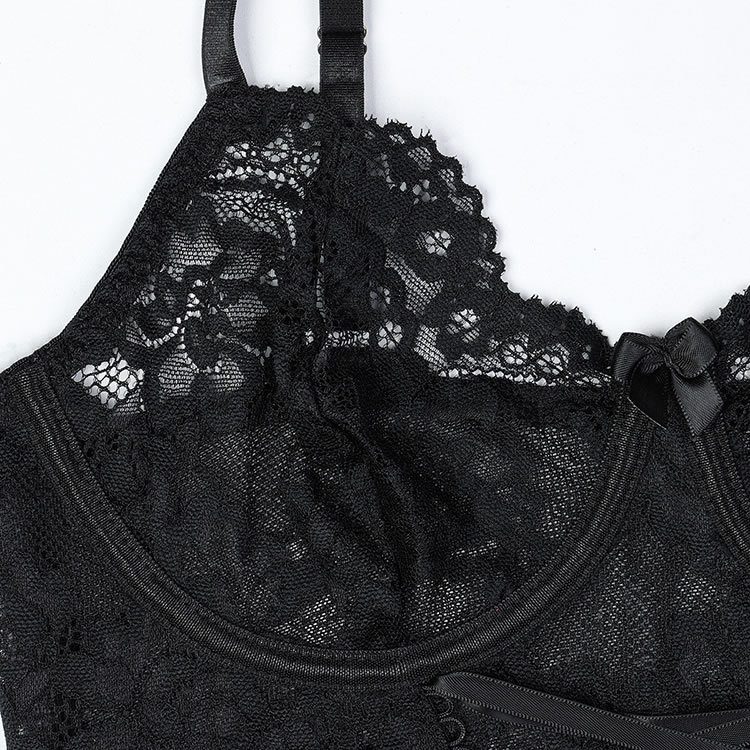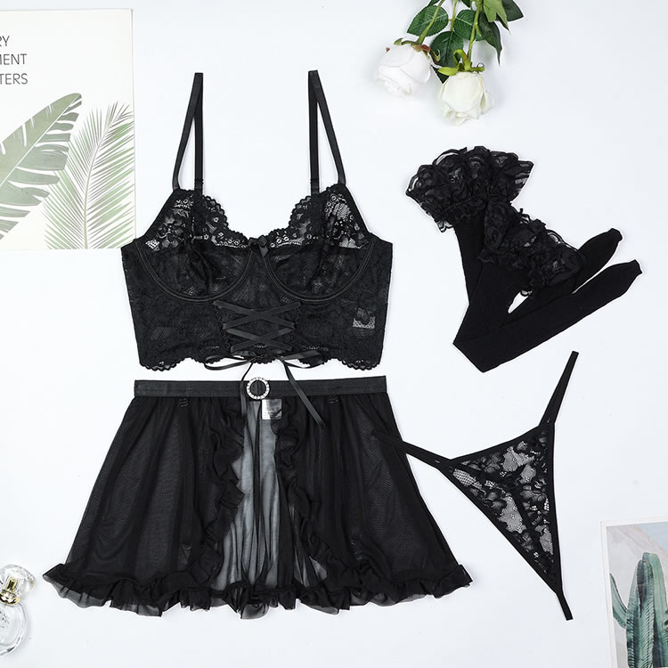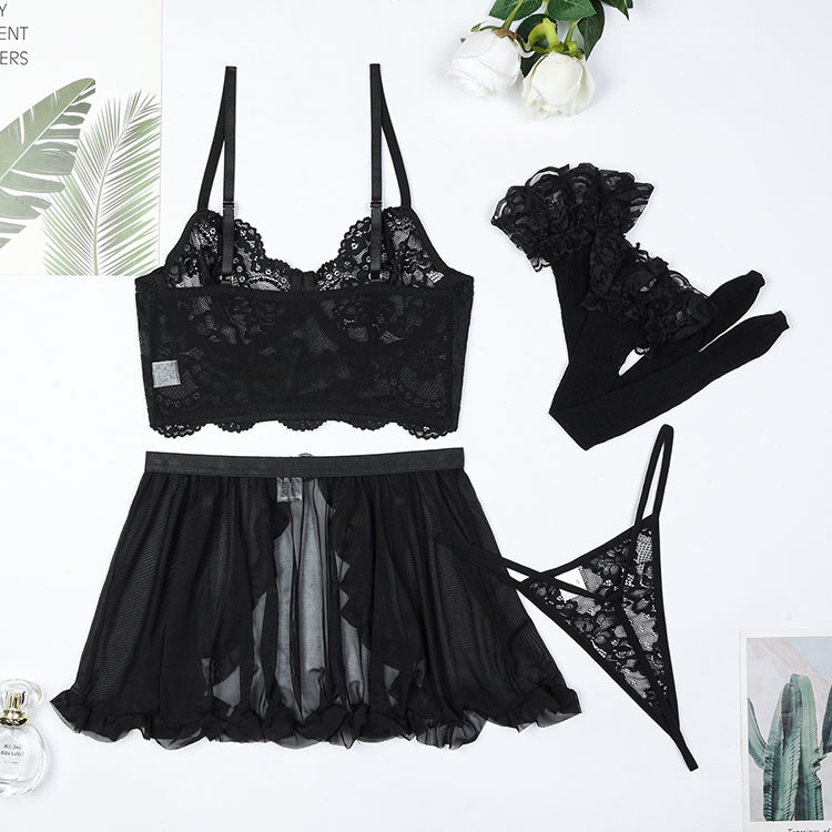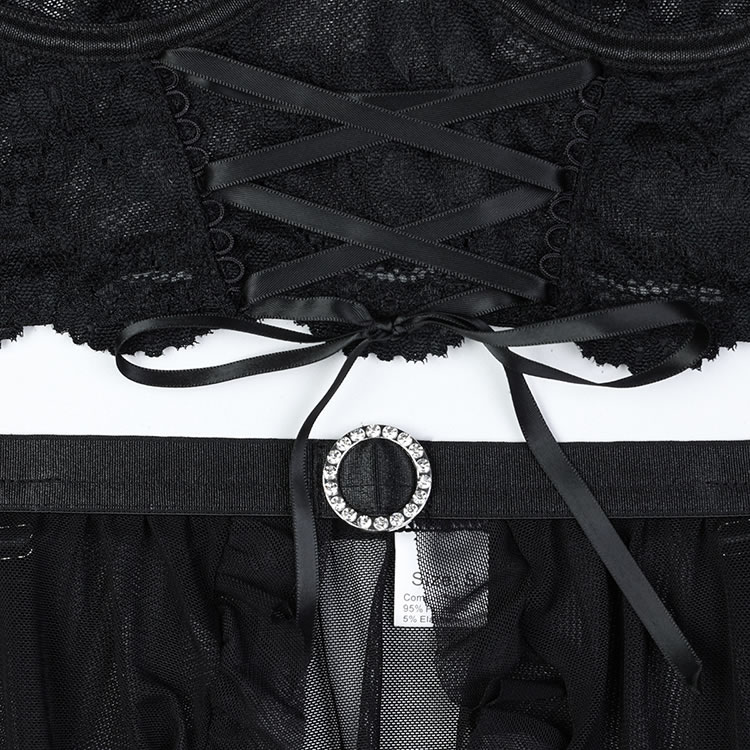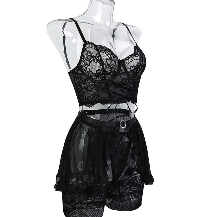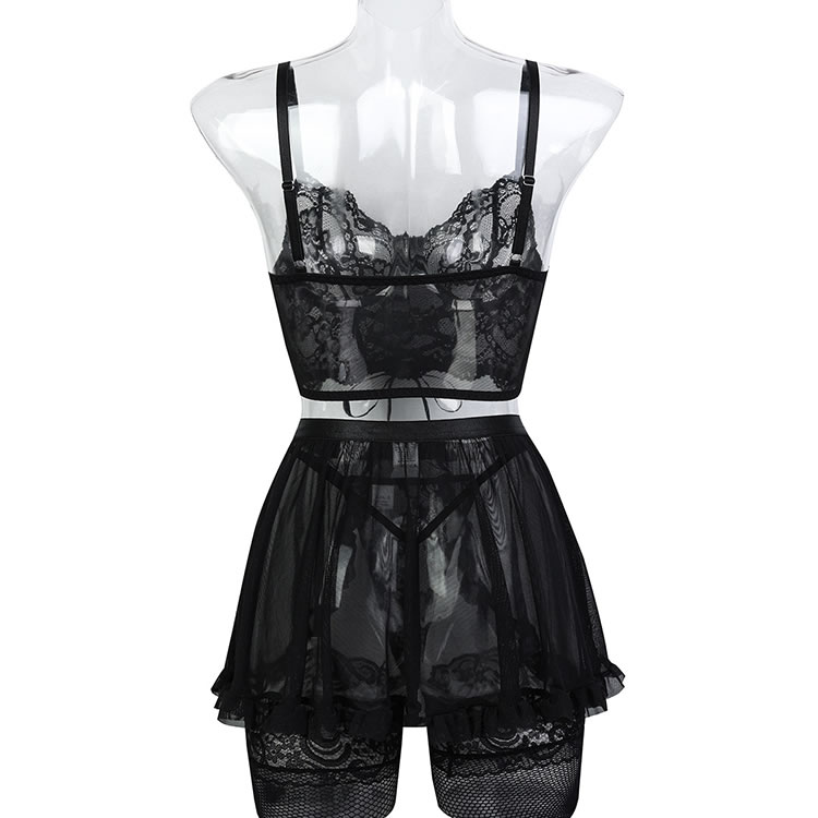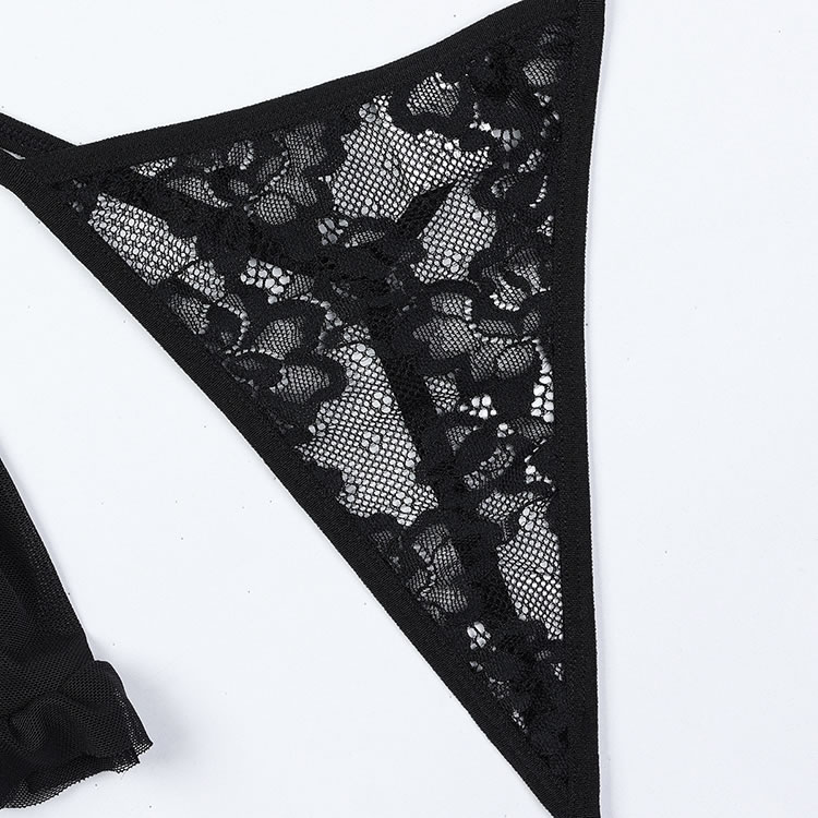 This flirty lingerie set is designed to exude elegance and allure. The bra features a deep V-neckline with intricate lace detailing, providing both support and sophistication. The sheer mesh fabric enhances the visual appeal, creating a seductive and feminine look. The matching thong and high-waisted garter belt with ruffle accents add a touch of playfulness and charm.
