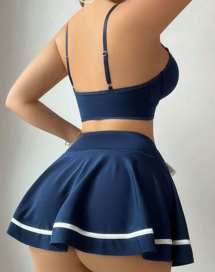 Dive into a world of playful allure with this charming sailor-inspired lingerie set. The navy blue bodice features a white satin bow that adds a touch of elegance, while the flared skirt with matching bows on the sides creates a delightful silhouette. Perfect for those who love to embrace their fun and flirty side, this ensemble is ideal for themed nights or special occasions.