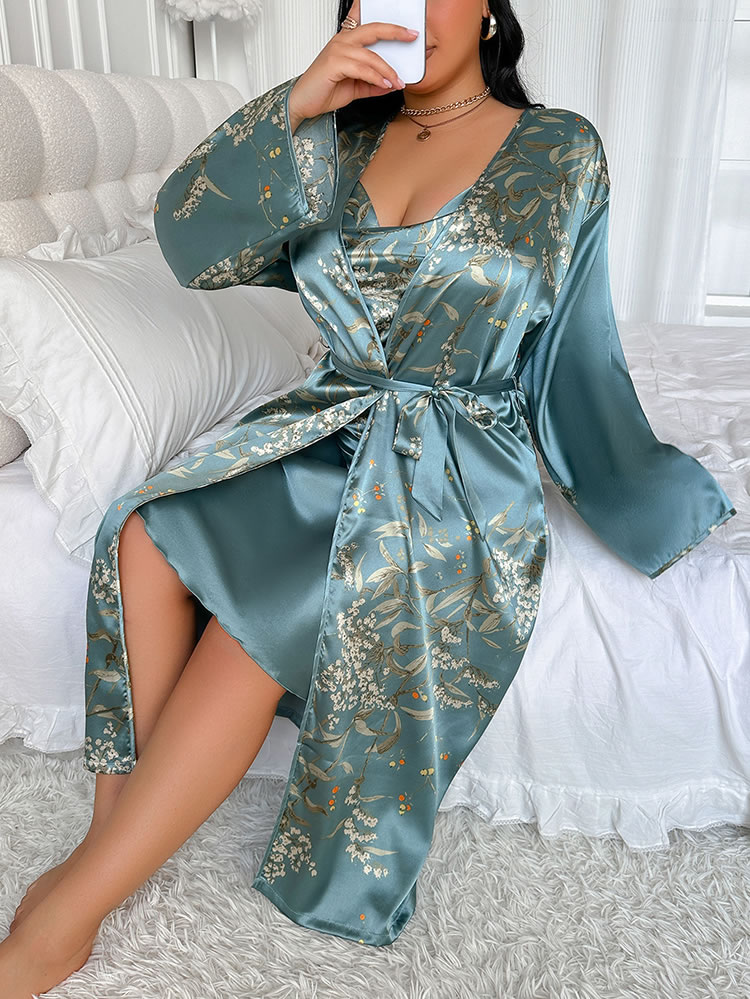 Step into style with this stylish teal satin nightwear set featuring a beautiful botanical print on the robe. The slip dress boasts a deep V-neckline and spaghetti straps, providing both comfort and a chic look. The accompanying robe enhances the overall ensemble, making it ideal for special nights or everyday indulgence.