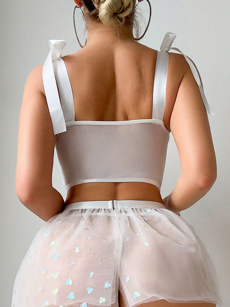 Embrace a whimsical and enchanting look with this white floral corset and tulle skirt set. The corset features delicate 3D flowers that add a touch of romance, while the sheer tulle skirt adorned with iridescent hearts creates a playful and dreamy vibe. Perfect for those who want to feel both feminine and alluring.