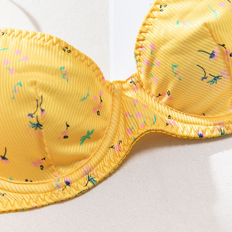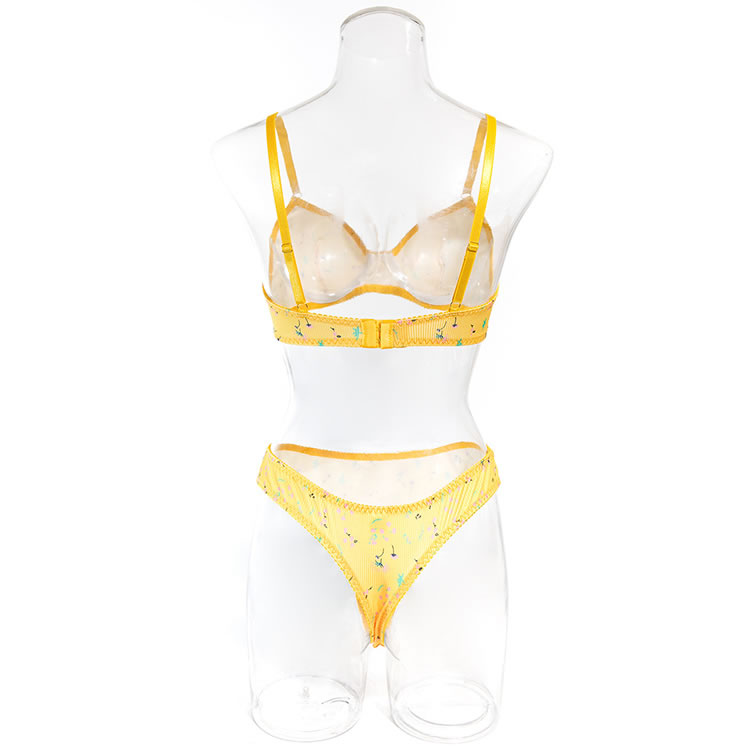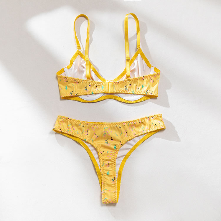 This vibrant yellow floral lingerie set is perfect for those who love to add a pop of color to their intimates. The bra features a playful floral pattern that adds a touch of fun and charm, while the matching panties ensure both comfort and style. The soft fabric creates a gentle and flattering fit, making it an ideal choice for anyone seeking a blend of confidence and playfulness.