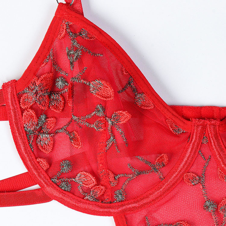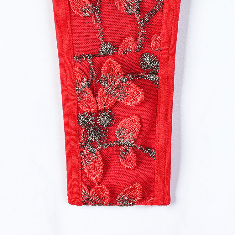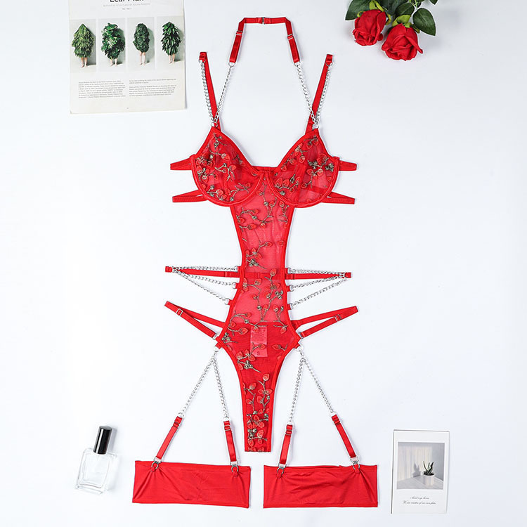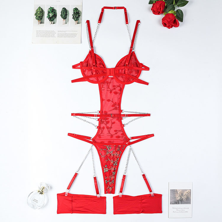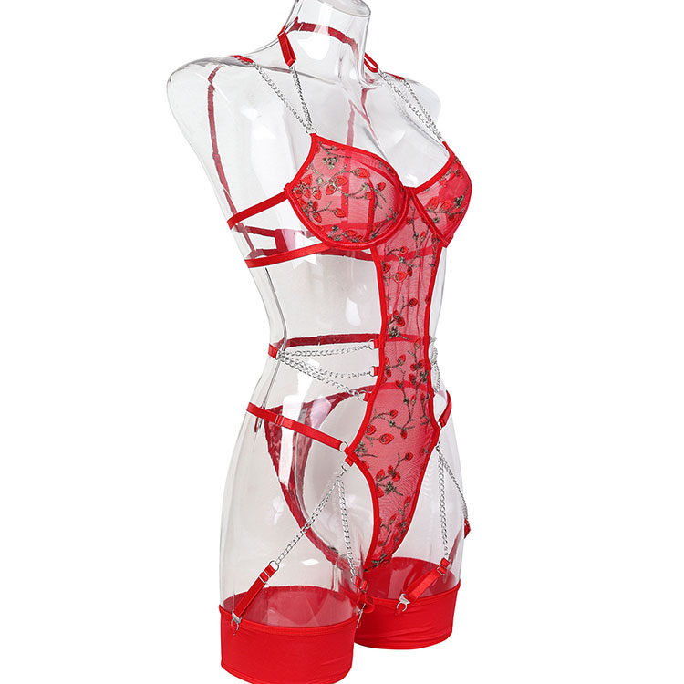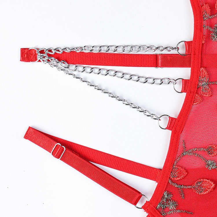 Stay chic and confident with this red embroidered lingerie set. The combination of intricate embroidery and silver chain detailing creates a stunning visual effect, perfect for adding a touch of glamour to your wardrobe.