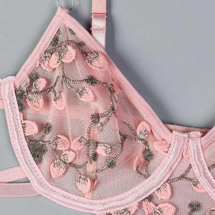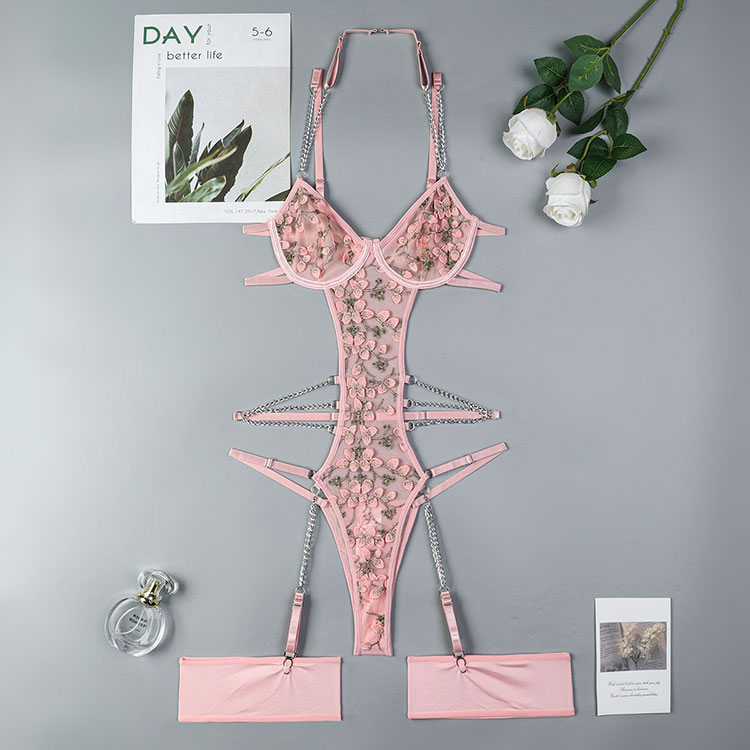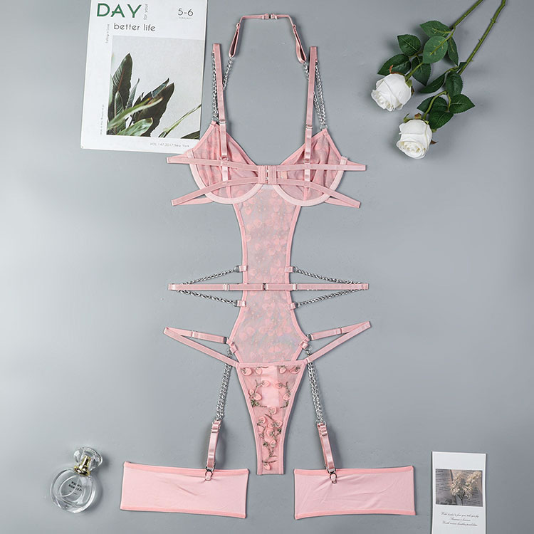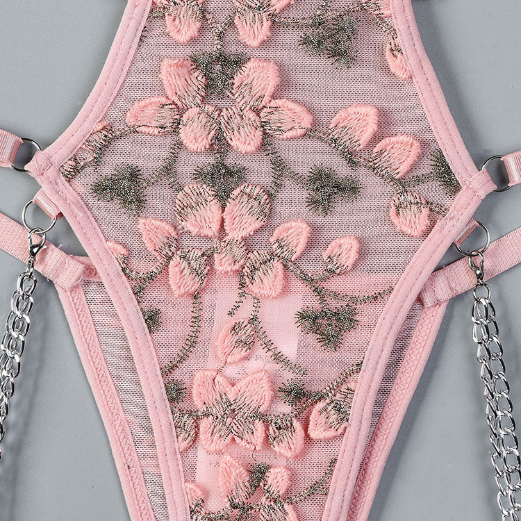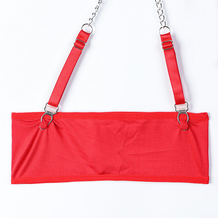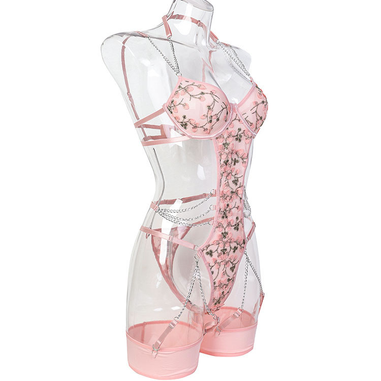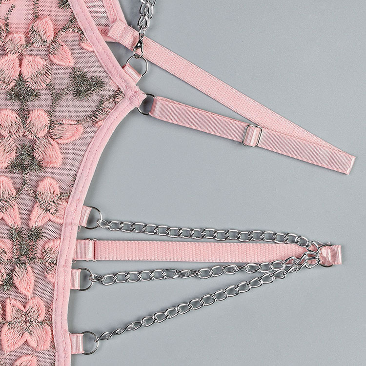 Stay chic and confident with this red embroidered lingerie set. The combination of intricate embroidery and silver chain detailing creates a stunning visual effect, perfect for adding a touch of glamour to your wardrobe.