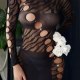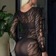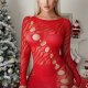 This striking red mesh dress is designed for bold holiday looks. Featuring long sleeves and a fitted silhouette, it's adorned with oval-shaped cutouts that run from the shoulders down the arms and across the torso, adding playful contrast. Small sparkles are scattered along the cutout lines, giving it a subtle shimmer perfect for Christmas parties or themed events.