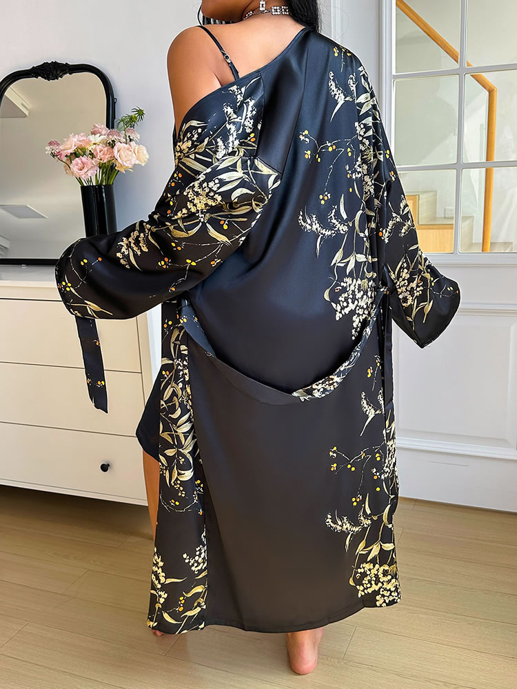 This robe combines a sleek black base with intricate floral patterns in gold for a sophisticated look. The soft, smooth fabric ensures comfort, while the wrap-around style with a tie belt allows for a personalized fit. Ideal for cozy evenings or adding style to your downtime.
