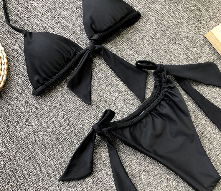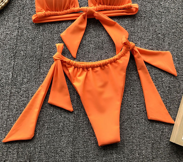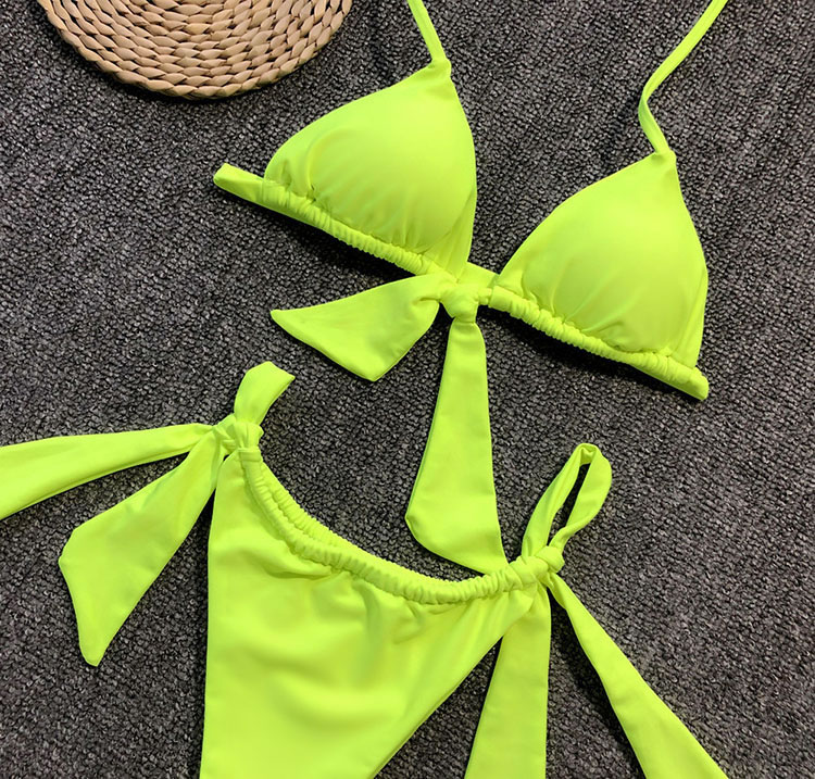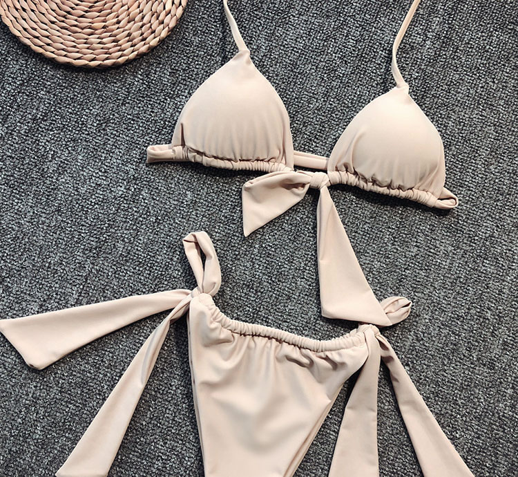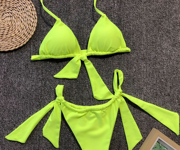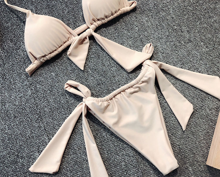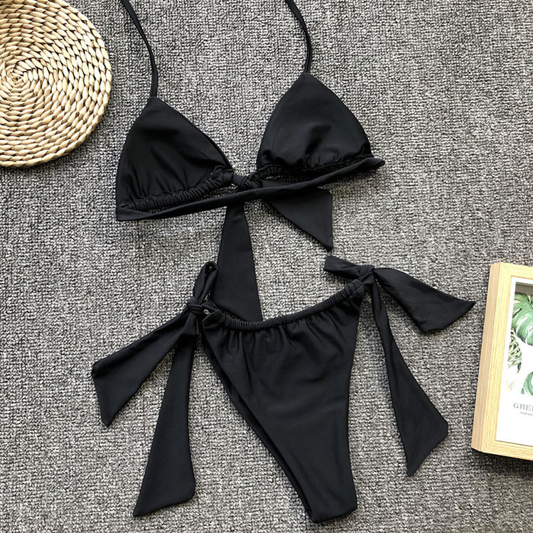Strut your stuff on the beach in this sexy bikini featuring a soft triangle cups, halter straps, and a matching string bottom with tie side closures and a thong cut back.