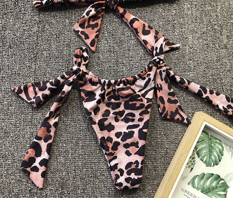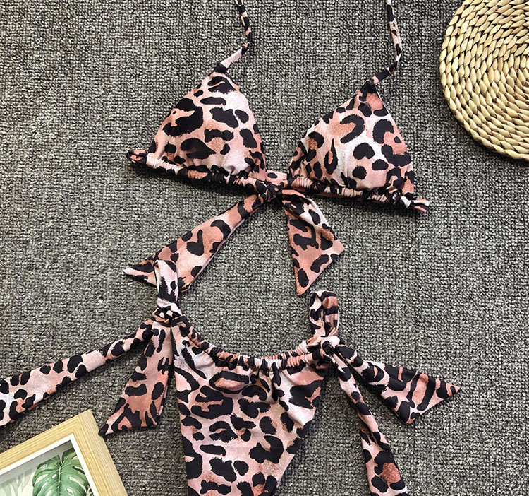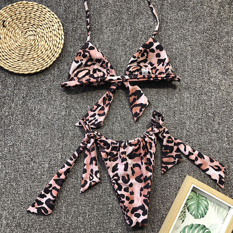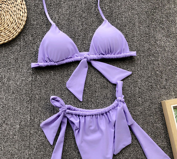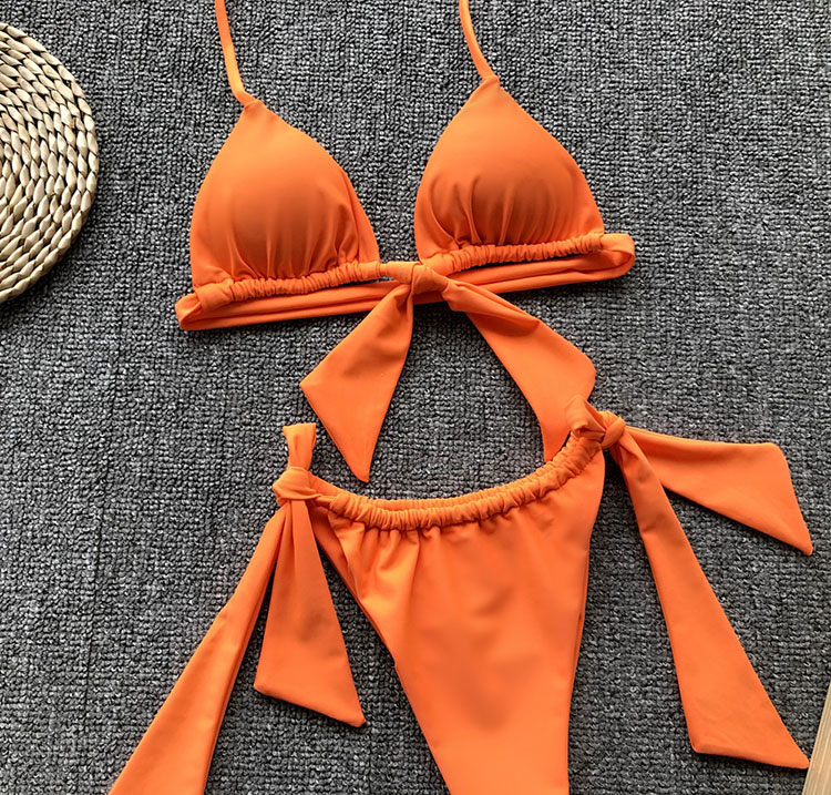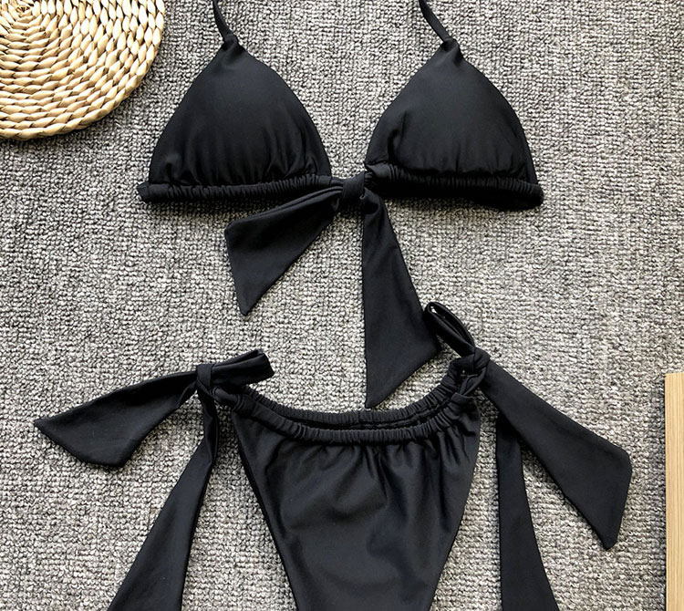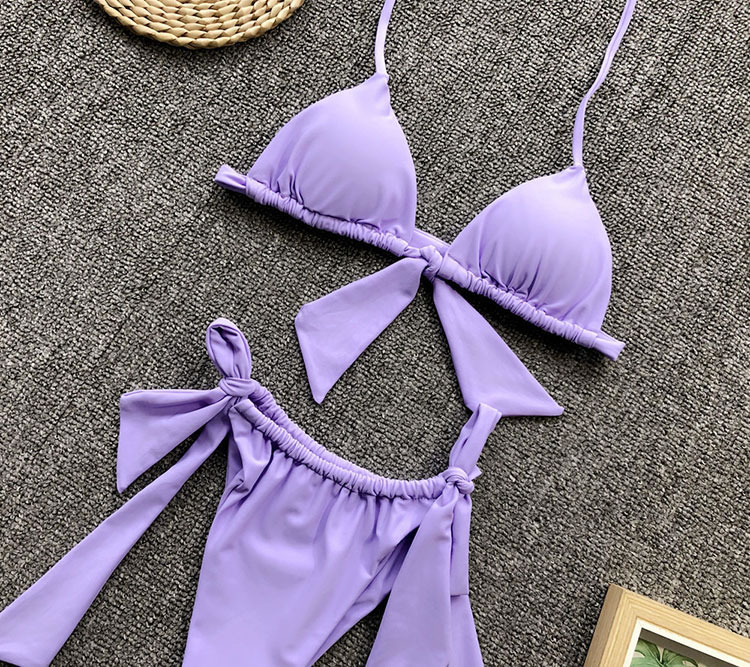 Strut your stuff on the beach in this sexy bikini featuring a soft triangle cups, halter straps, and a matching string bottom with tie side closures and a thong cut back.