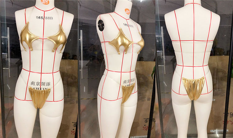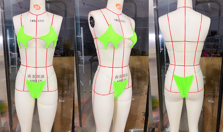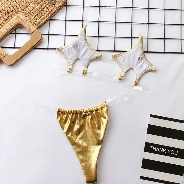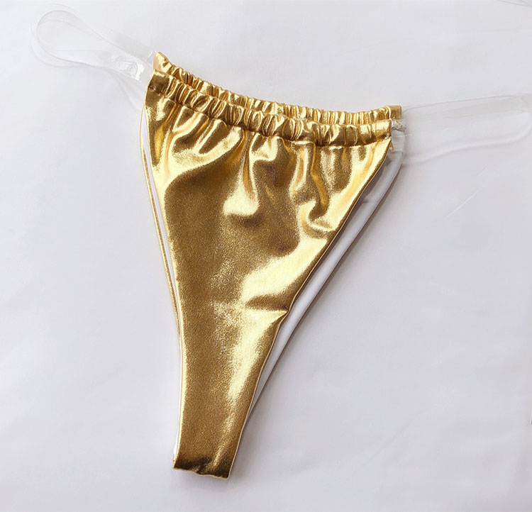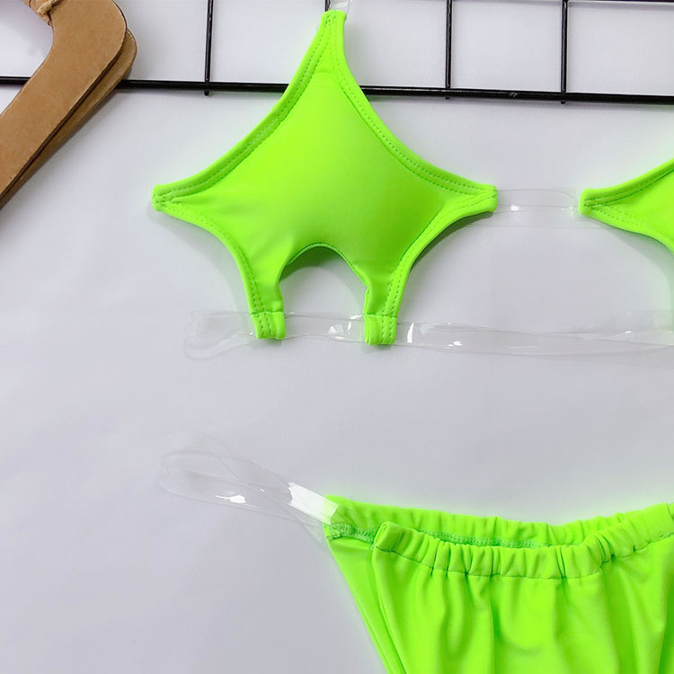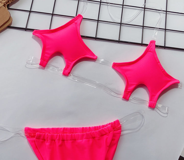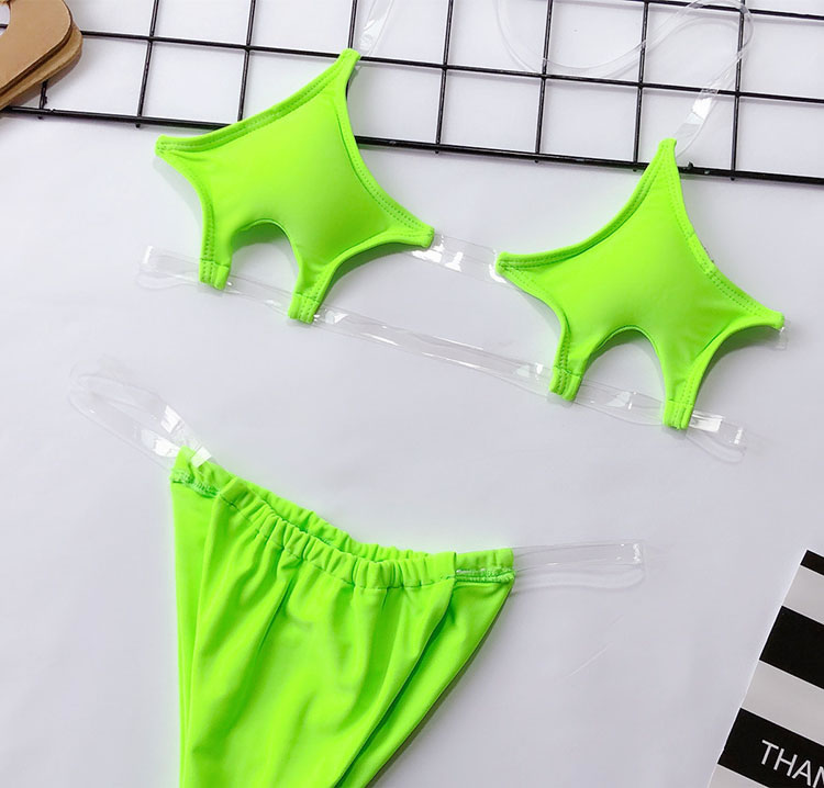 Look fiercely sexy in this bikini set featuring pentagram cups, clear halter straps, clear underbust straps, and matching micro bottoms with clear straps and thong back.