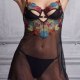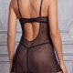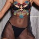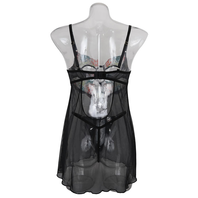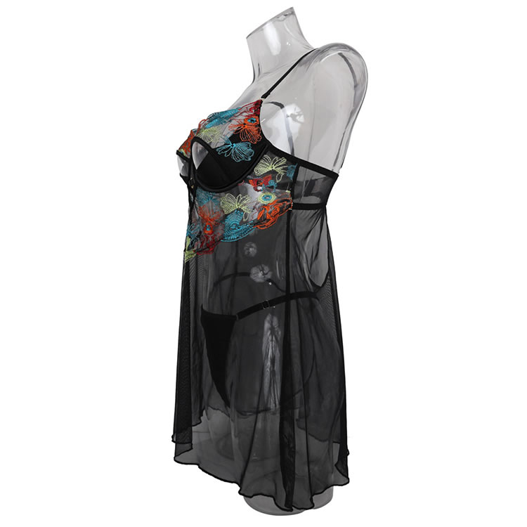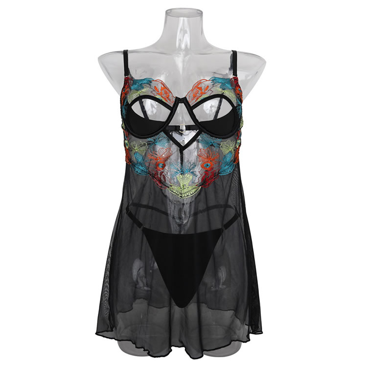 This eye-catching chemise set features a sheer black mesh overlay adorned with vibrant, multi-colored floral embroidery. The bodice showcases a bold cutout design with a central metal ring detail, adding an edgy touch to the romantic floral pattern. The adjustable spaghetti straps lead to a low, open back, while the matching sheer skirt flows loosely over the hips, revealing the included matching briefs underneath for a teasing, see-through effect.