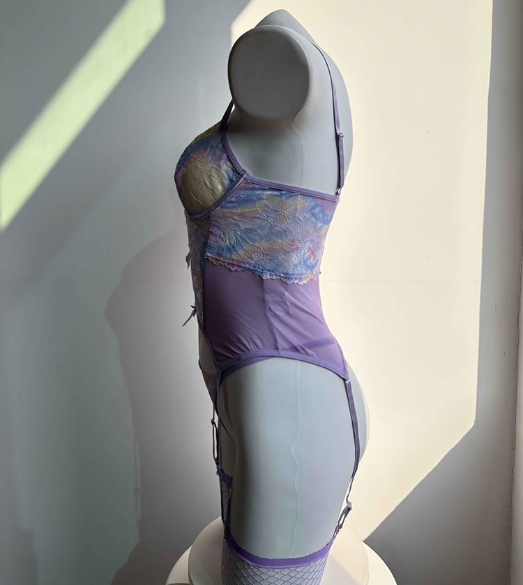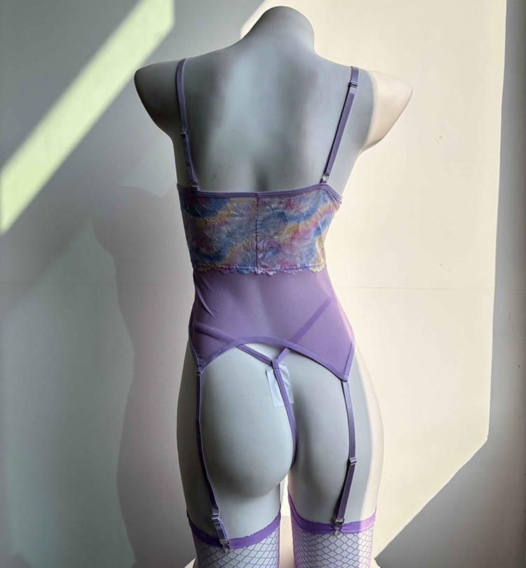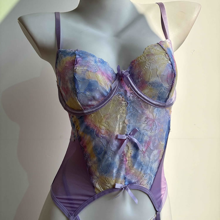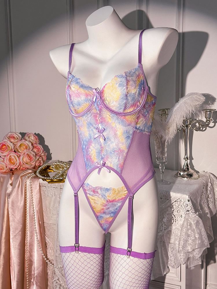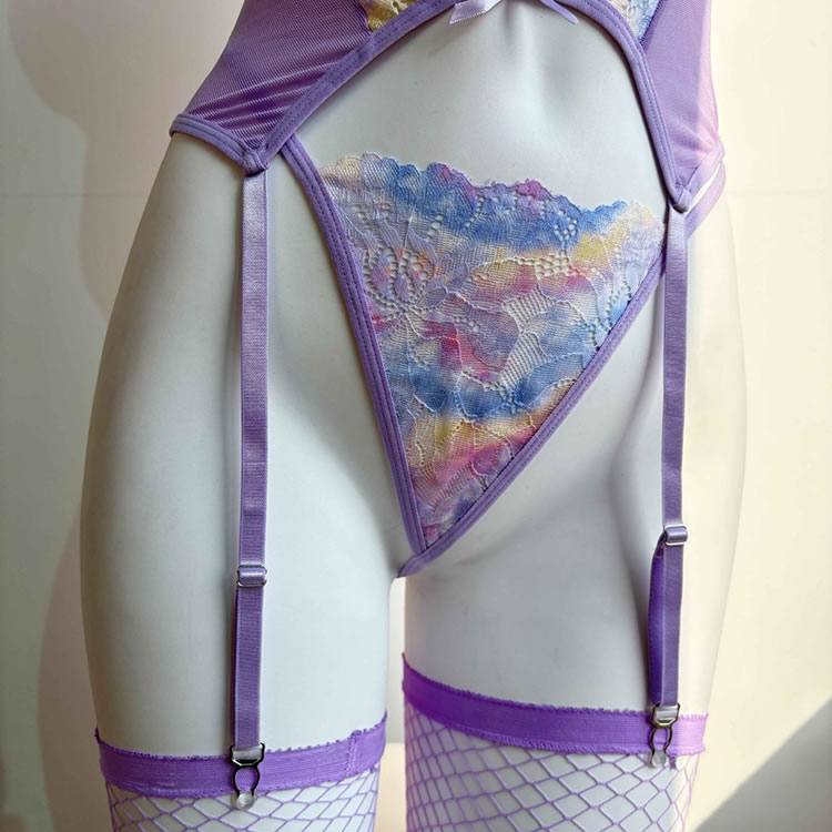 Make a statement with this striking lingerie set that combines soft pastel tones with bold lace detailing. The corset-style chemises features a colorful floral lace overlay in shades of pink, blue, and yellow, creating a dreamy, artistic effect across the chest and back. Designed with adjustable straps and a front bow accent, it offers both structure and elegance. The matching thong includes delicate lace trim and is paired with garter straps that hold fishnet stockings in place, adding a touch of vintage charm. Perfect for those who love to blend creativity with confidence, whether for special moments or self-expression at home.