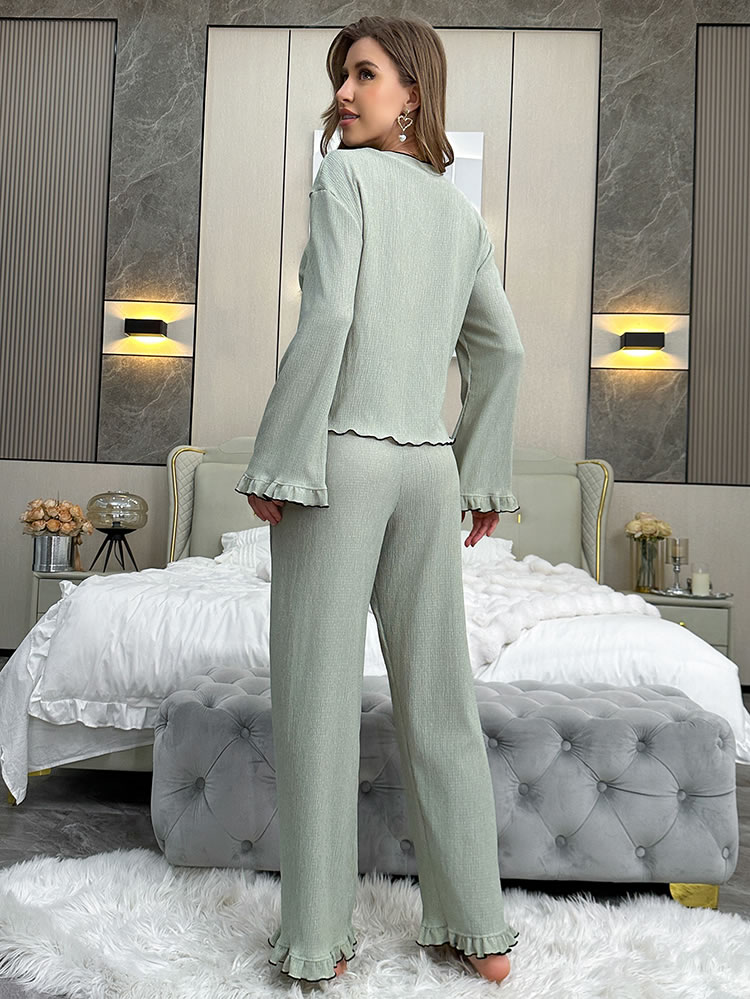 This cozy and stylish lingerie set is perfect for lounging in comfort. The top features a V-neckline with a delicate tie-front detail, adding a touch of elegance. The long sleeves are adorned with ruffle trim at the cuffs, enhancing the feminine appeal. The matching high-waisted pants are designed with a comfortable fit and also feature ruffle trim at the hem, creating a cohesive and chic look. Made from soft, breathable fabric, this set is ideal for both relaxation and casual wear.