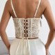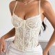 This elegant cream-colored bustier features delicate floral lace over base, creating a sophisticated and feminine look. Designed with adjustable spaghetti straps for a custom fit, it offers both style and comfort. The back showcases a classic lace-up closure with ribbon ties, allowing you to cinch the waist for a flattering silhouette. Perfect for pairing with high-waisted skirts or trousers for a chic evening outfit.