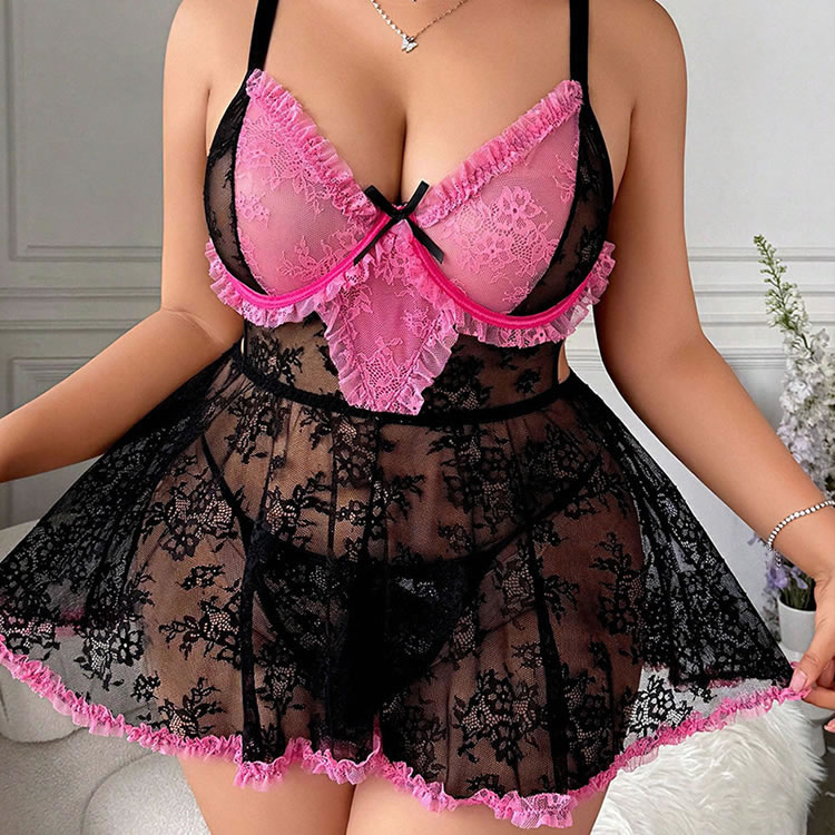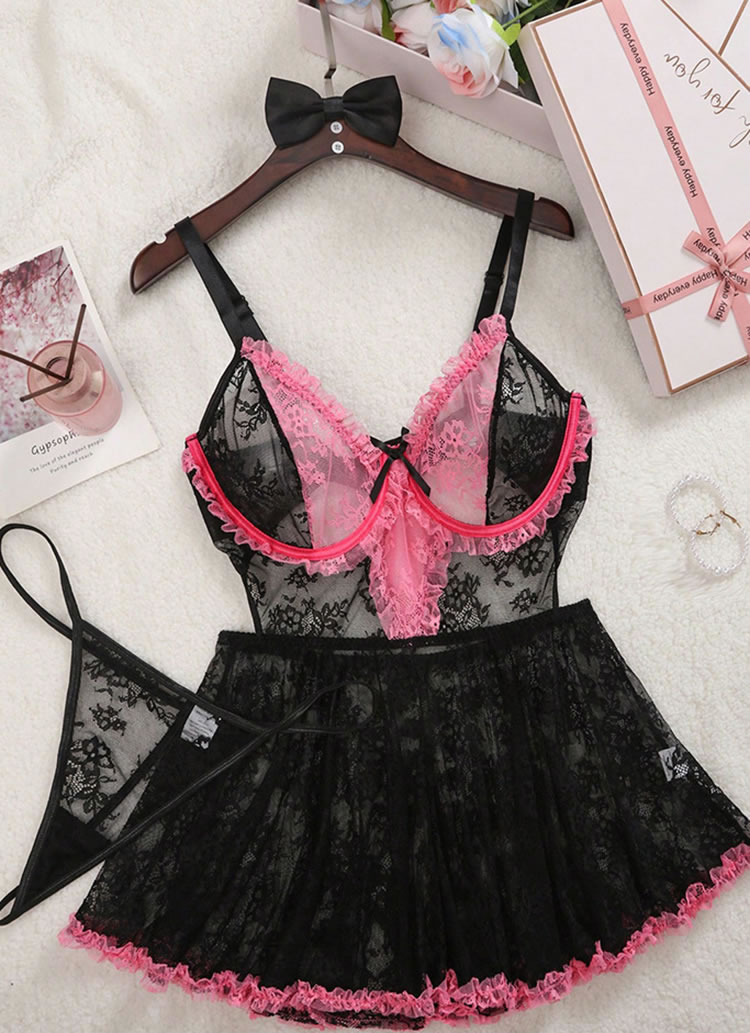 This bold black lace babydoll gets a sweet pop of color with bright pink ruffles along the cups and hem. The sheer floral lace overlay gives a romantic yet edgy vibe, while the soft inner lining ensures you feel comfortable all night. Adjustable straps and back closure let you customize the fit — perfect for date nights, boudoir photos, or just feeling fabulous on your own terms.