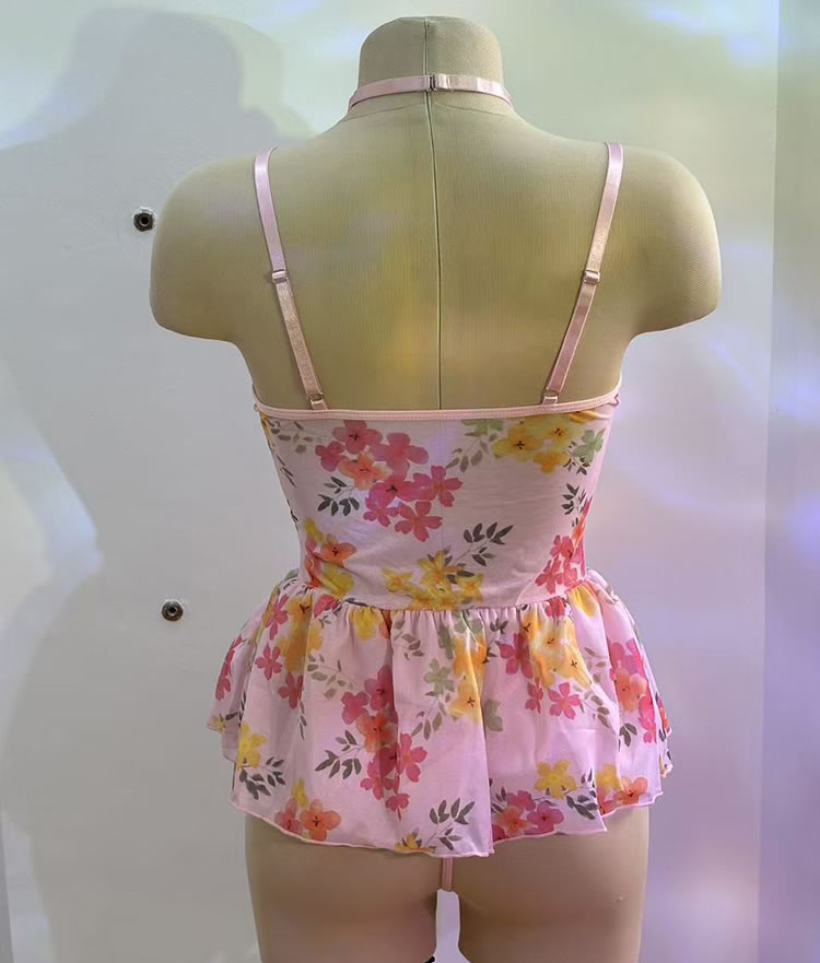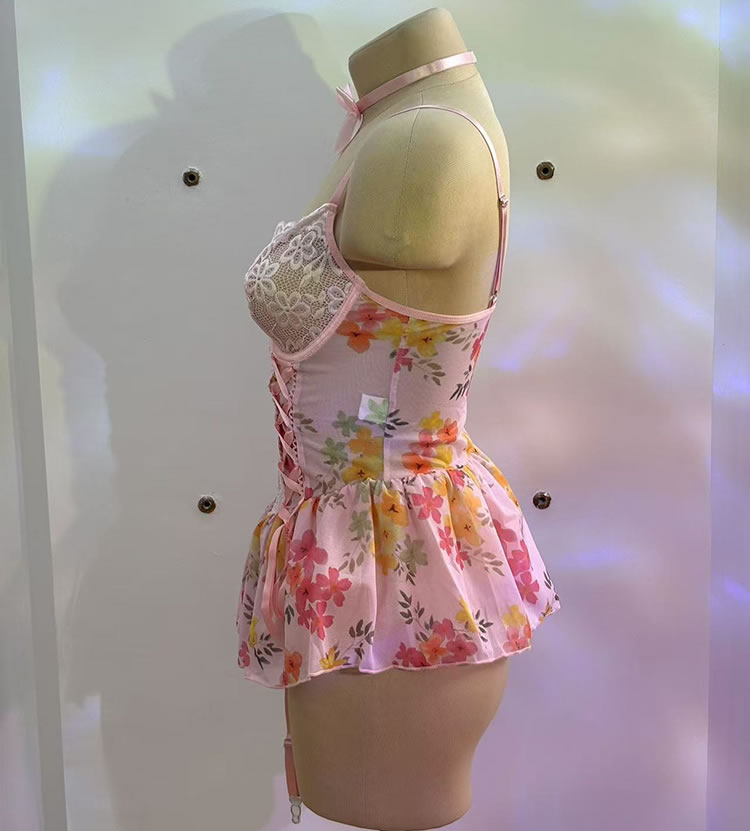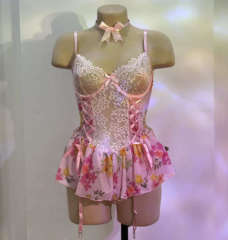Dress up your night with this sweet and flirty floral lingerie set that blends soft romance with a touch of playfulness. Featuring delicate lace detailing on the bustier top and a charming pink floral skirt, this ensemble is perfect for adding a whimsical vibe to your intimate moments. Adjustable straps and ribbon ties offer a personalized fit, while the matching garter straps keep your thigh-highs securely in place. Complete the look with the included choker for a full, coordinated style that’s both cute and captivating.