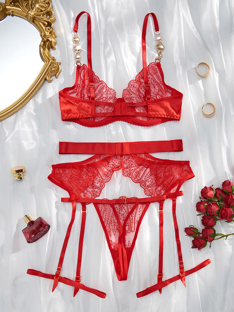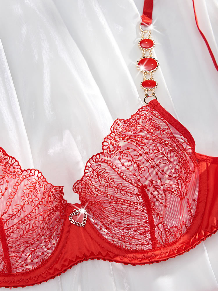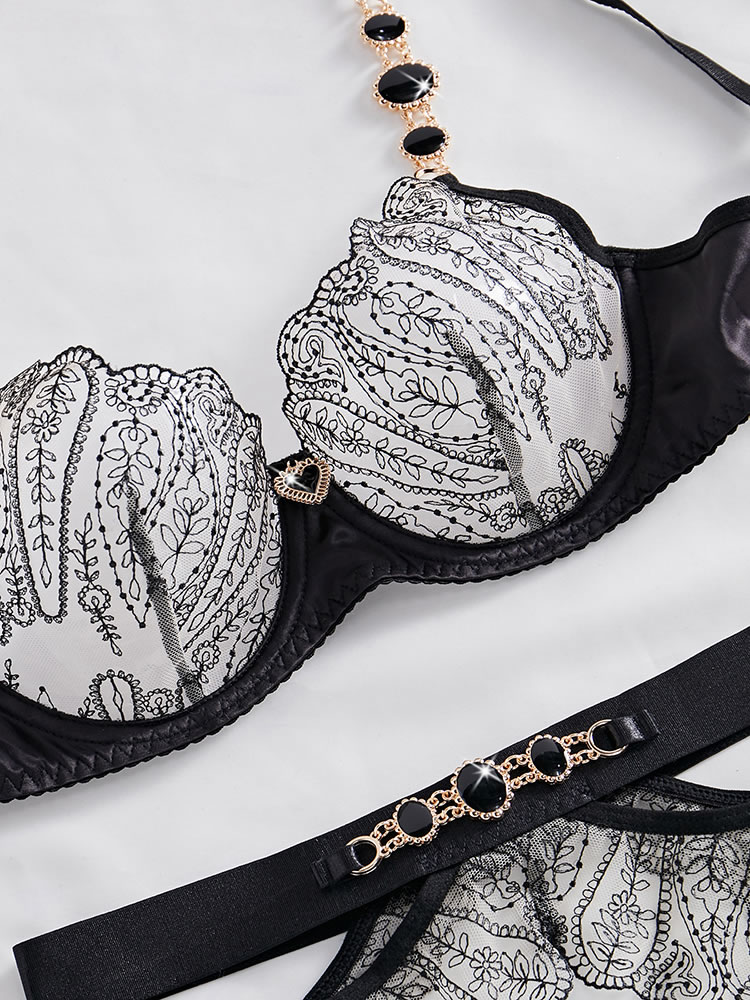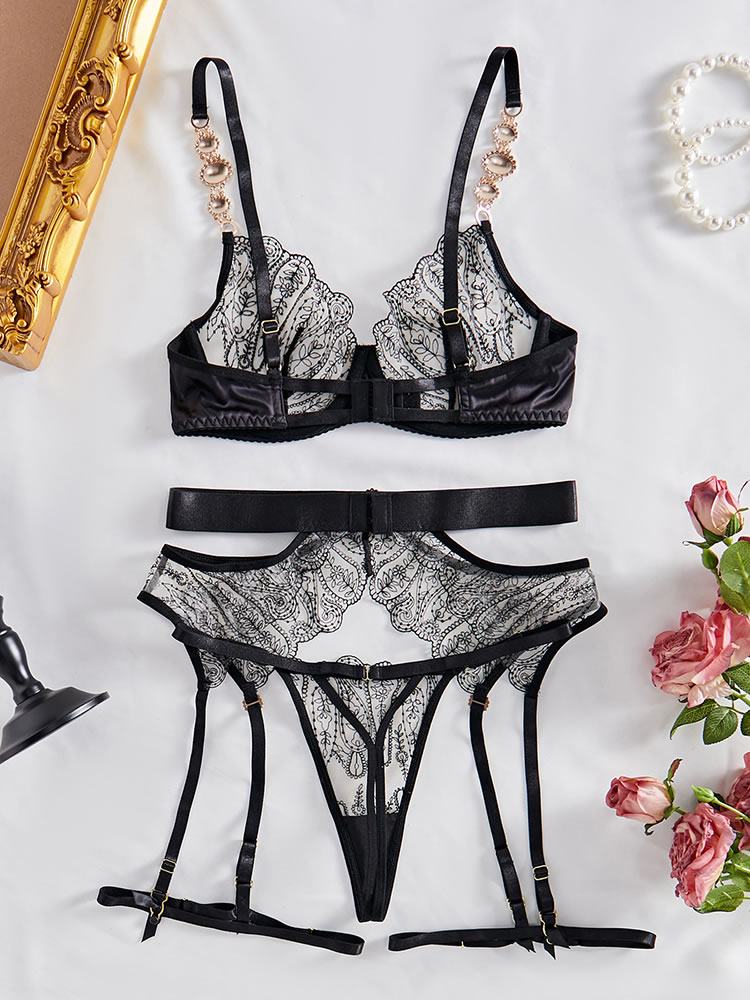 Elevate your evening with this alluring bra set, featuring sheer mesh underwire cups adorned with intricate embroidery. Adjustable spaghetti straps and a hook-and-eye back closure ensure a perfect fit. Complete the look with a matching high-waisted garter belt, adjustable garter straps, wraparound leg garters, and a coordinating thong panty.
