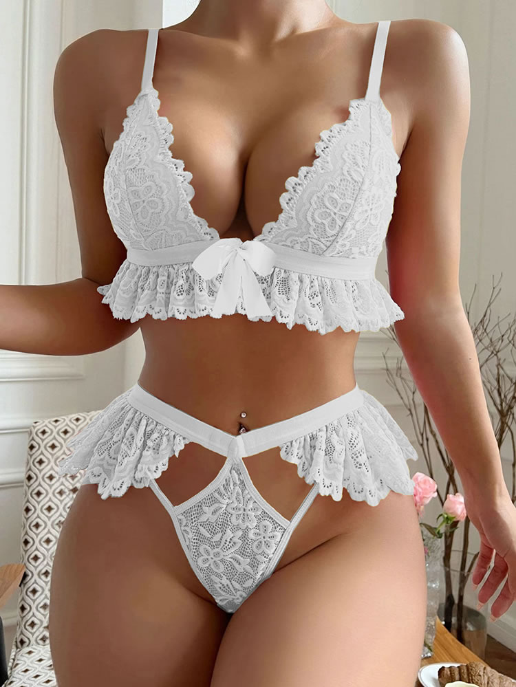 You'll have your lover awake until dawn in this captivating bra set featuring sheer lace triangle cups, adjustable spaghetti straps, a cute satin front bow, a ruffled hem, a matching panty with a ruffled waistband, cut-out panels, and a thong cut back.