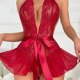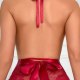 This lace teddy is a bold choice for those who want to make a statement. The intricate lace detailing covers the entire piece, offering both allure and comfort. The halter neck design with a deep V-front adds an extra layer of sophistication, while the ruffled skirt and ribbon tie at the waist enhance its playful charm. Perfect for special occasions or intimate moments.