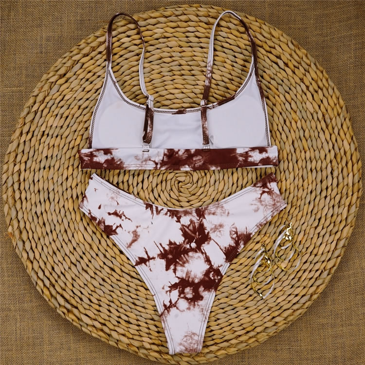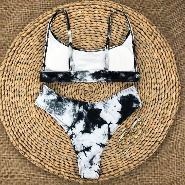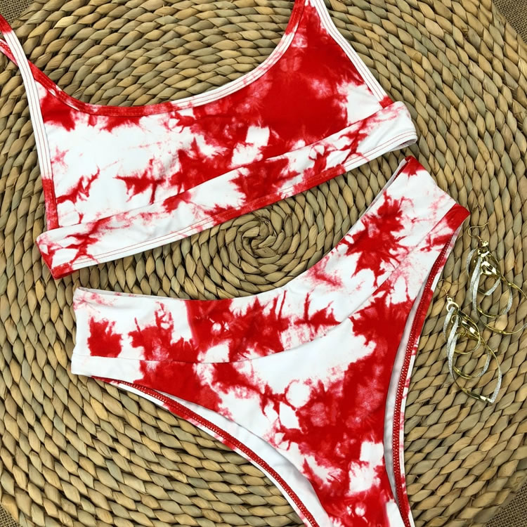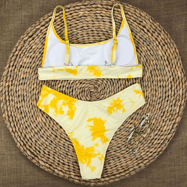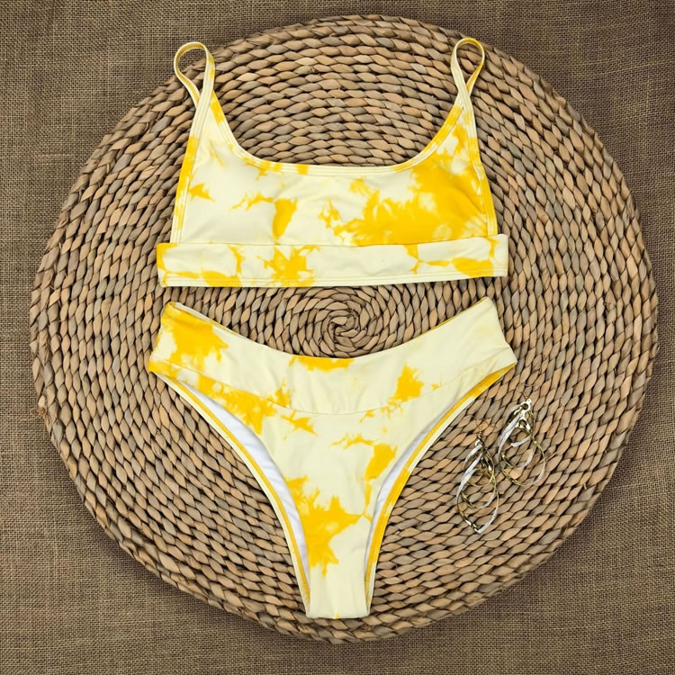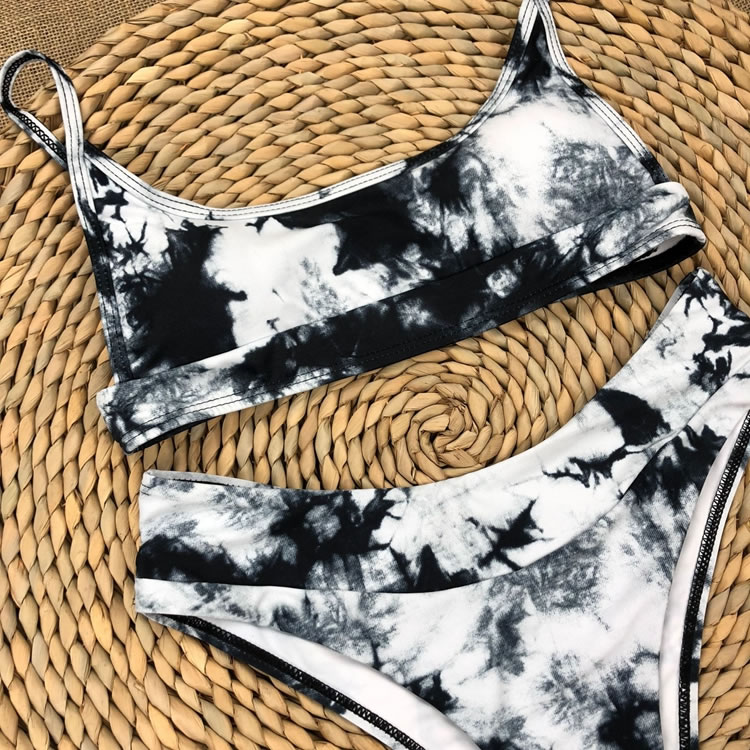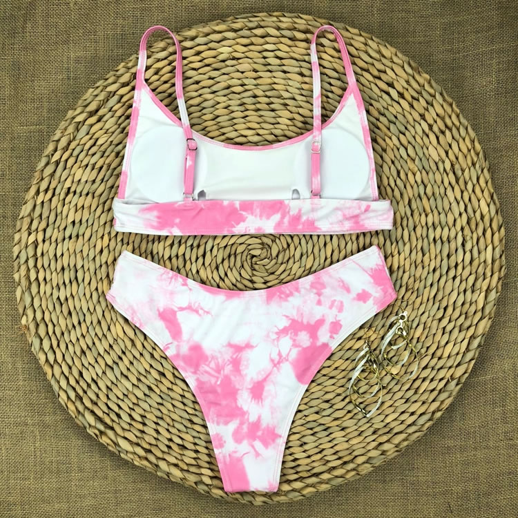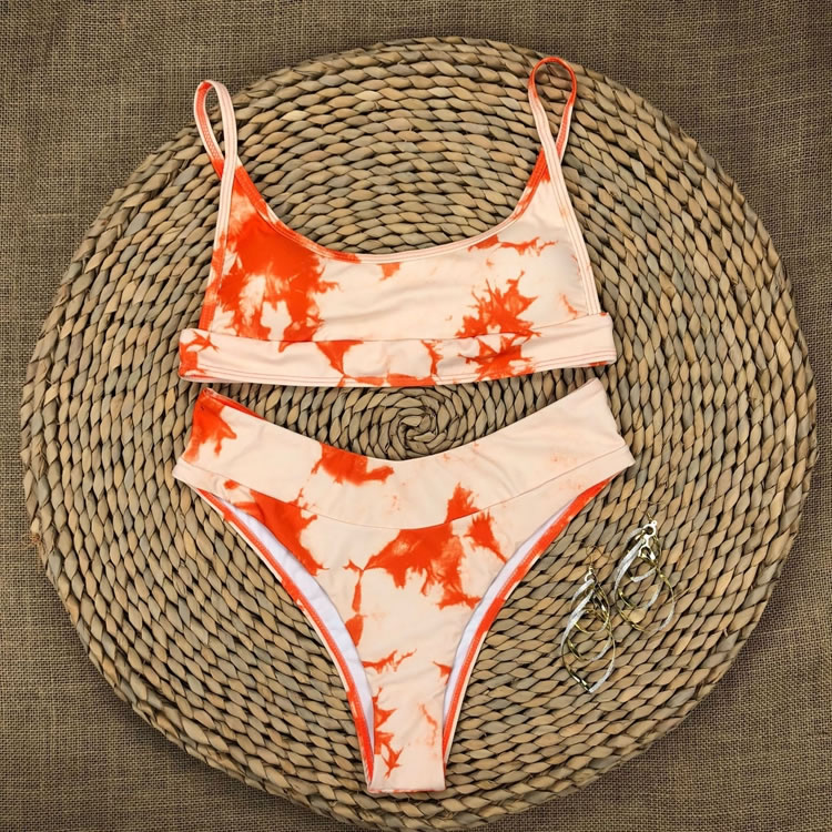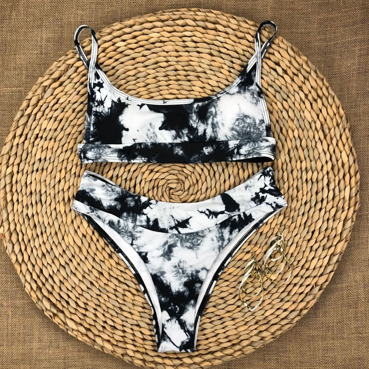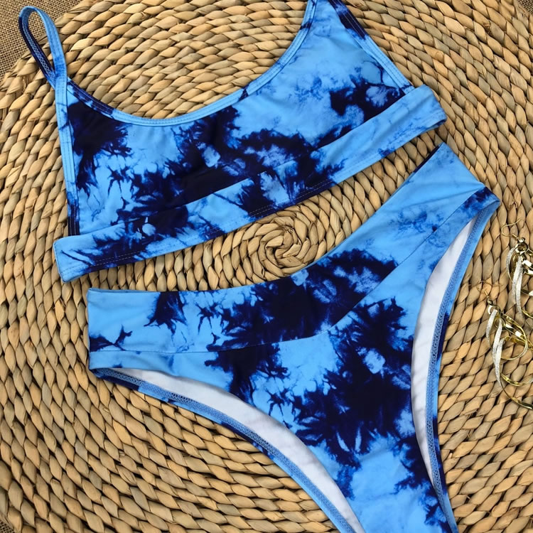 Sail into the sunset in this stunning two piece swimsuit featuring a straight neckline, adjustable spaghetti straps, and a matching high waisted bottom with a cheeky cut back.