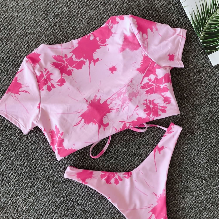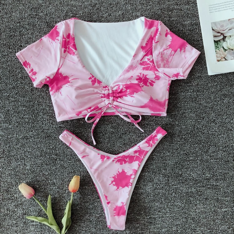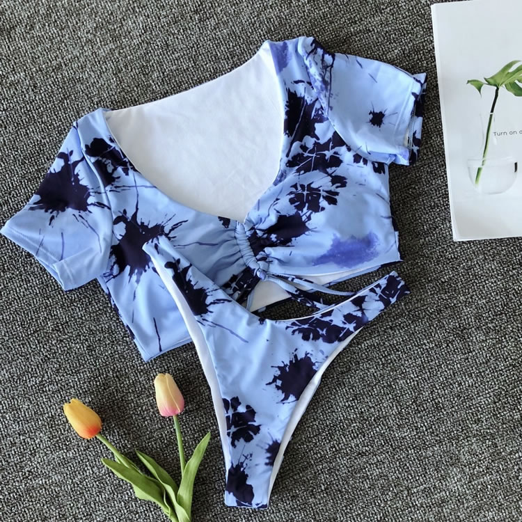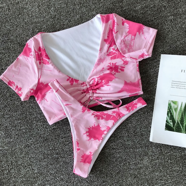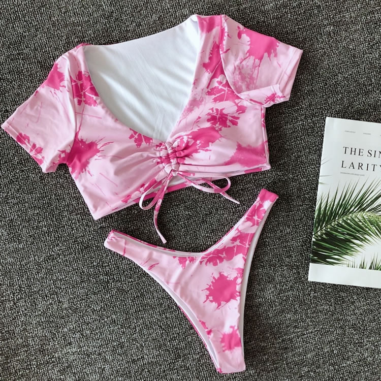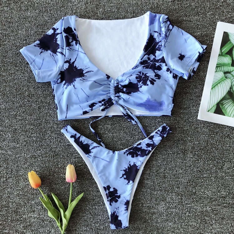 Sail into the sunset in this stunning two piece swimsuit featuring short sleeve, a strappy front with a tie closure, and a matching bottom with a low rise waist, a cheeky cut back.