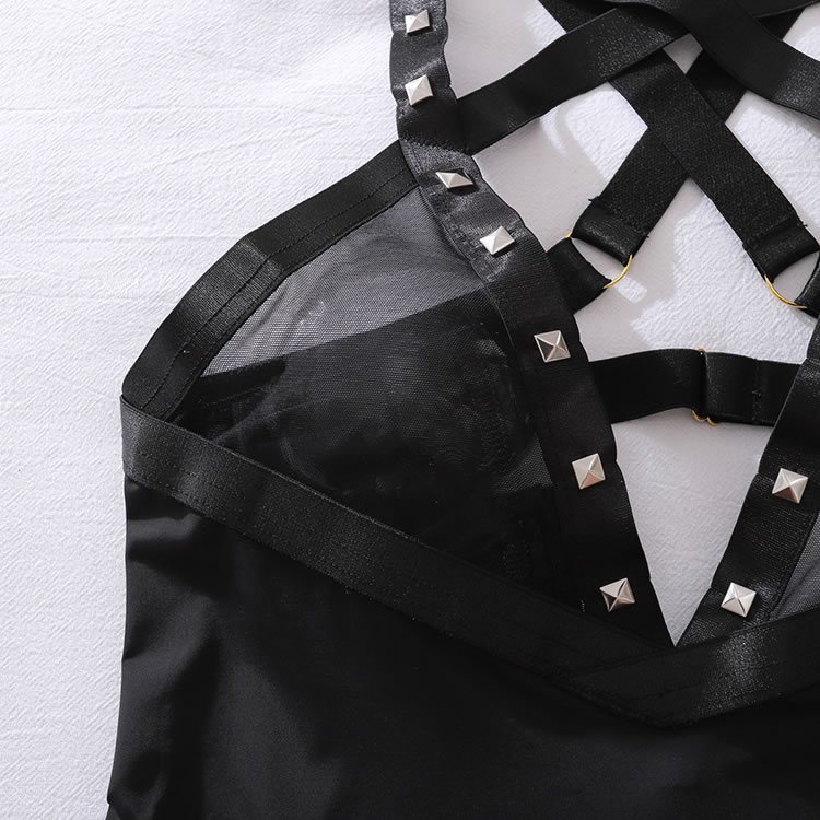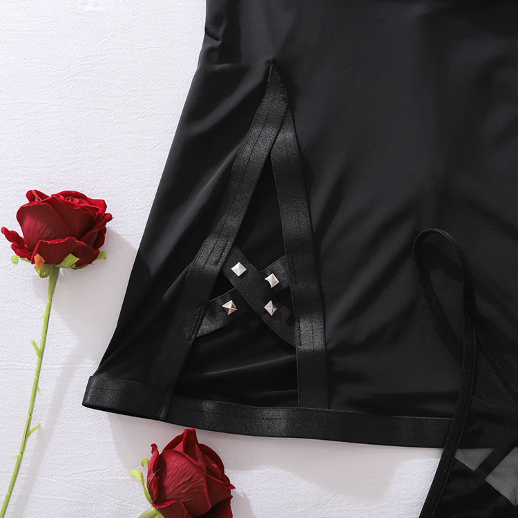 Command attention in this edgy black bodycon dress featuring a striking crisscross halter neckline adorned with silver studs. The sheer mesh panels at the bust add a daring touch of transparency, while the side cutouts and adjustable straps create a flattering, figure-hugging silhouette. Designed with a low-cut back and gold-toned hardware, this piece offers a unique blend of gothic and modern aesthetics, making it a versatile choice for bold fashion statements.