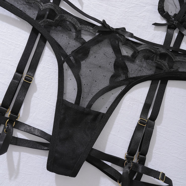 This bold and daring lingerie set combines sheer mesh detailing for a sultry silhouette that turns heads. The matching bra features delicate straps and structured support, while the high-cut briefs with crisscross ties and garter belt with adjustable garter straps accentuate every curve. Designed to make a statement, this set is perfect for those who love edgy elegance and confidence-boosting style.