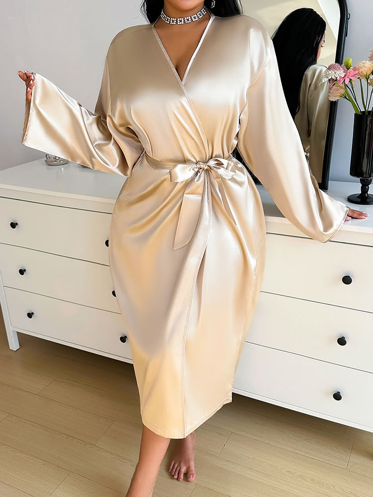 This elegant beige satin robe is a perfect blend of comfort and style. The smooth fabric feels delightful against the skin, ensuring all-day comfort. The wrap-around design with a waist tie adds a touch of sophistication, making it an ideal choice for both lounging at home and special evenings.