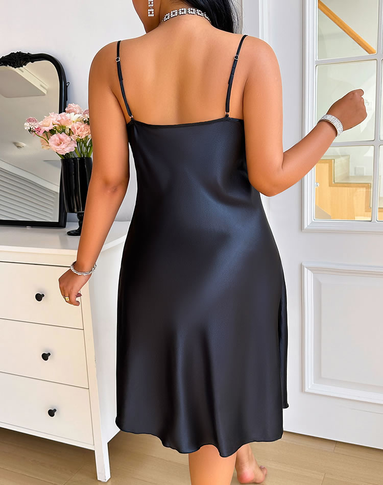 This elegant black satin slip dress is a timeless piece that combines simplicity with sophistication. The smooth, soft fabric feels delightful against the skin, ensuring ultimate comfort. The classic V-neckline and spaghetti straps accentuate your natural curves, making it perfect for both lounging at home and special evenings.